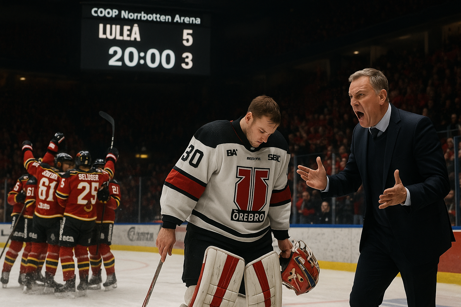 Dramatic illustration of Örebro Hockey's 5-3 defeat to Luleå, featuring frustrated coach Niklas Eriksson and goaltender Jonas Arntzen being pulled from the game.