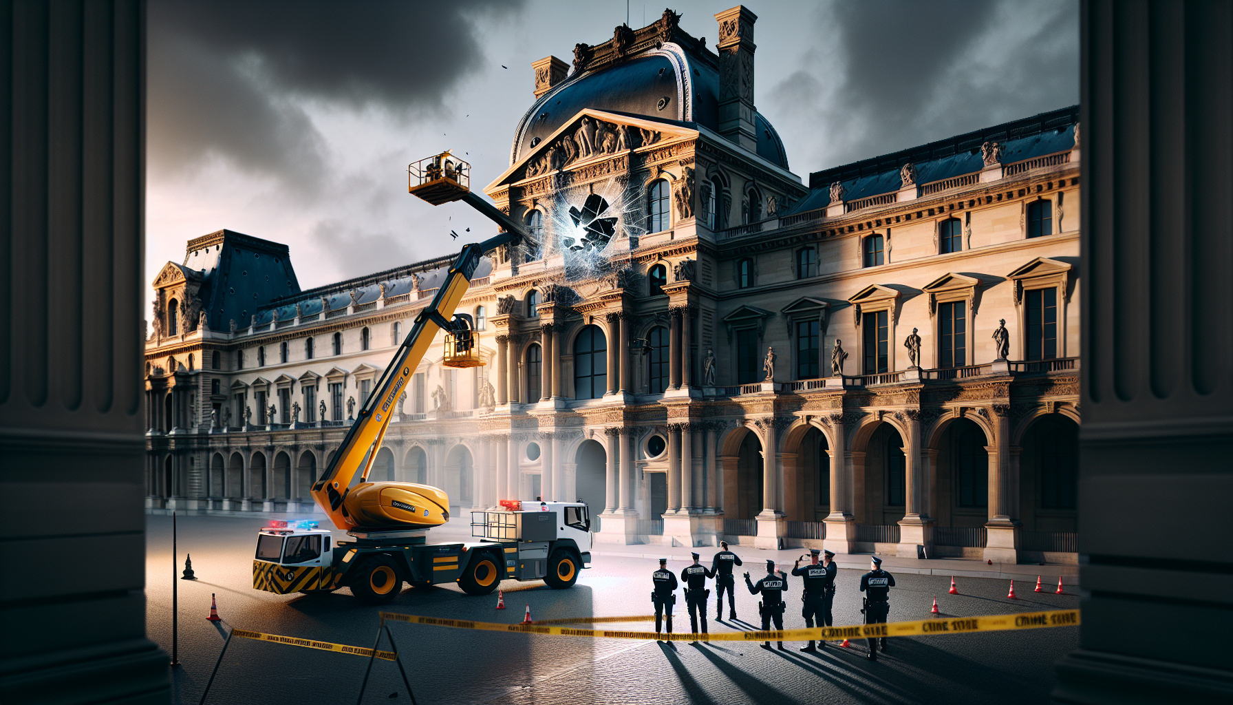 Aftermath of a daring burglary at the Louvre Museum, showing a broken window, cherry picker, and police investigation.