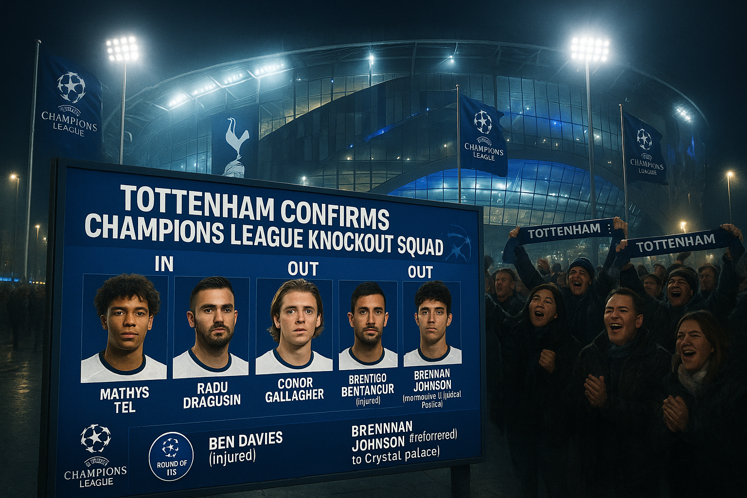 Tottenham Hotspur stadium with graphic overlay announcing Champions League knockout squad changes, including new players Mathys Tel, Radu Dragusin, and Conor Gallagher.