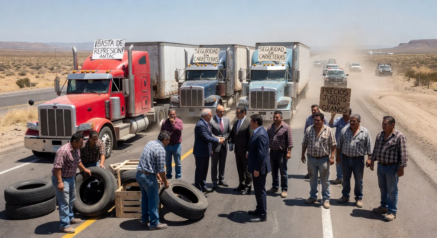 Truckers and farmers blockade a Mexican highway with trucks and tractors, protesting for improved security, end to extortion, and grain price support.