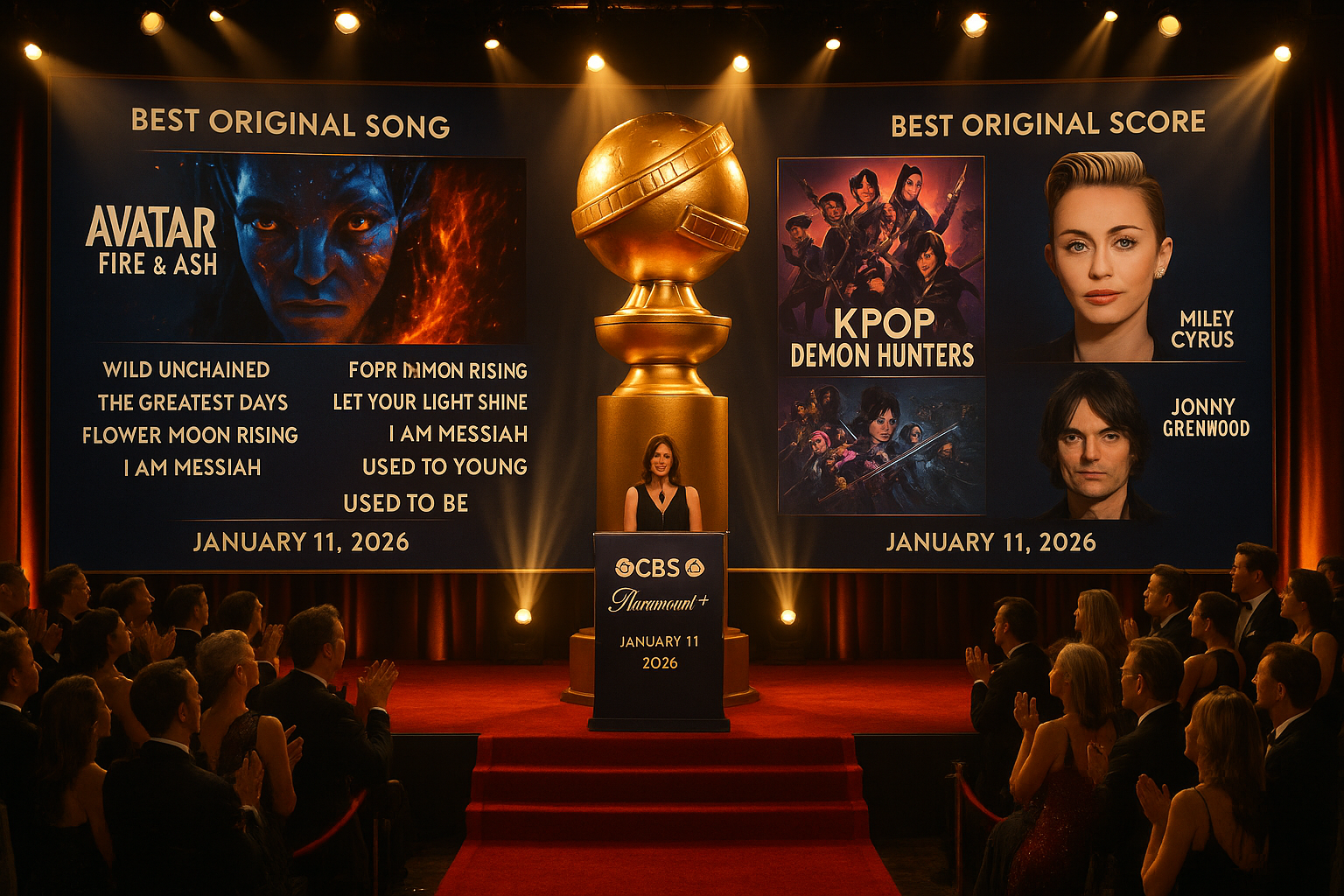 The 83rd annual Golden Globe Awards have announced their nominees for Best Original Song and Best Original Score in motion pictures, highlighting tracks from films like Avatar: Fire & Ash and KPop Demon Hunters. Six songs and six scores made the list, featuring artists such as Miley Cyrus and composers like Jonny Greenwood. The ceremony is set for January 11, 2026, on CBS and Paramount+.