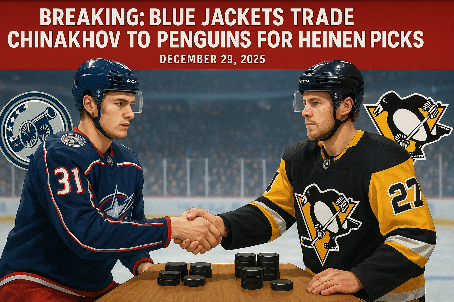 Les Columbus Blue Jackets ont échangé l'attaquant Yegor Chinakhov aux Pittsburgh Penguins le 29 décembre 2025 en retour de l'attaquant Danton Heinen et deux choix de repêchage. Chinakhov, ailier russe de 24 ans qui a demandé un échange en juillet en raison de différends avec son entraîneur, rejoint désormais Pittsburgh. Cette transaction apporte à Columbus des actifs de repêchage supplémentaires et une profondeur organisationnelle.