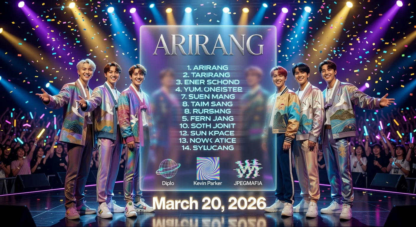 BTS a révélé la tracklist de 14 chansons de son prochain album Arirang, prévu pour le 20 mars 2026. L'album comprend des collaborations avec des producteurs tels que Diplo, Kevin Parker et JPEGMAFIA. Il s'agit du premier album complet du groupe depuis Be en 2020.