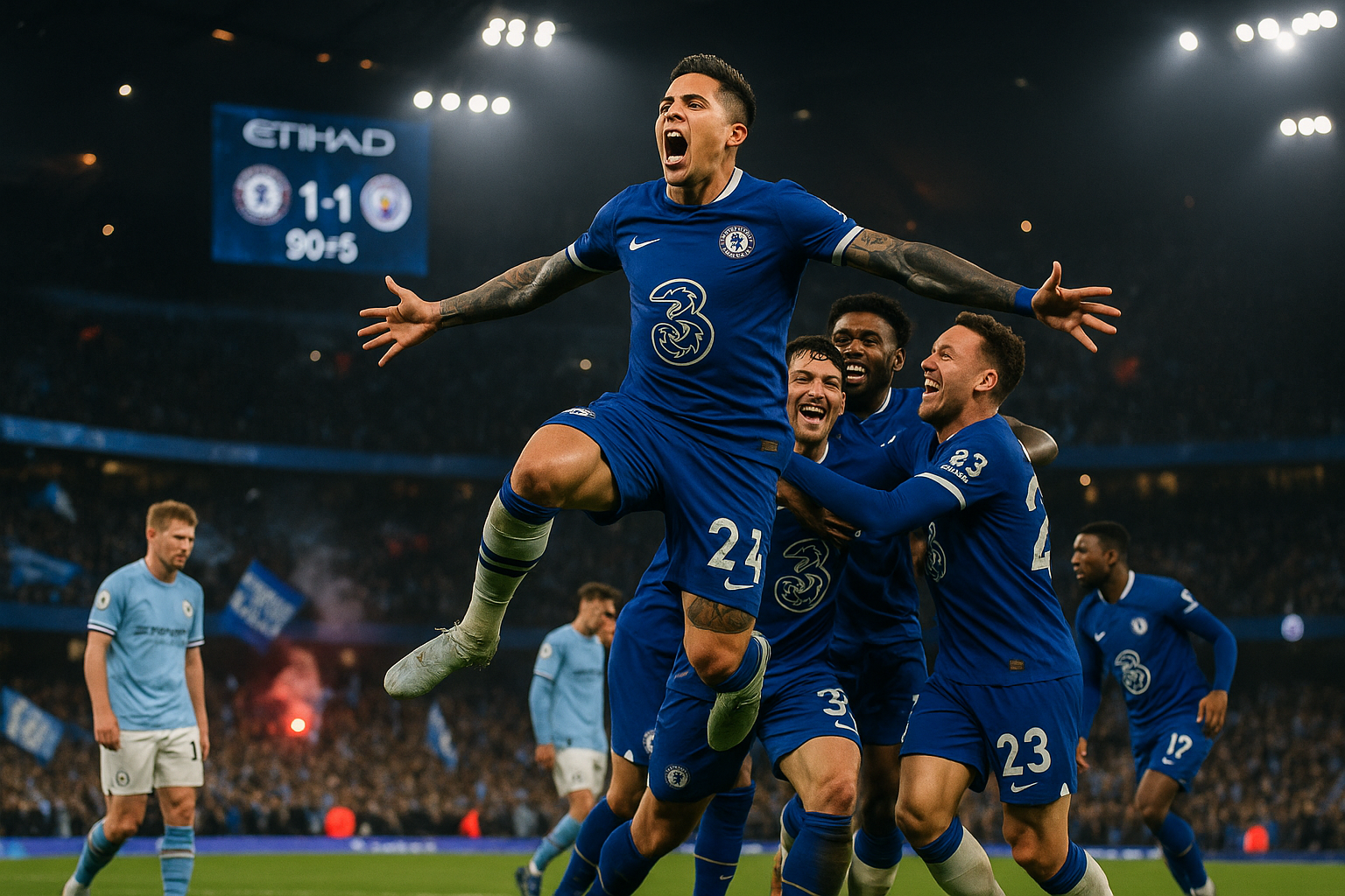 Enzo Fernandez a marqué un but égalisateur dans le temps additionnel alors que Chelsea sans entraîneur a tenu Manchester City en échec 1-1 au Etihad Stadium. Tijjani Reijnders avait donné l'avantage aux hôtes en première mi-temps, mais la résilience de Chelsea sous l'intérim de Calum McFarlane leur a valu un point vital. Le résultat laisse City à six points des leaders Arsenal.
