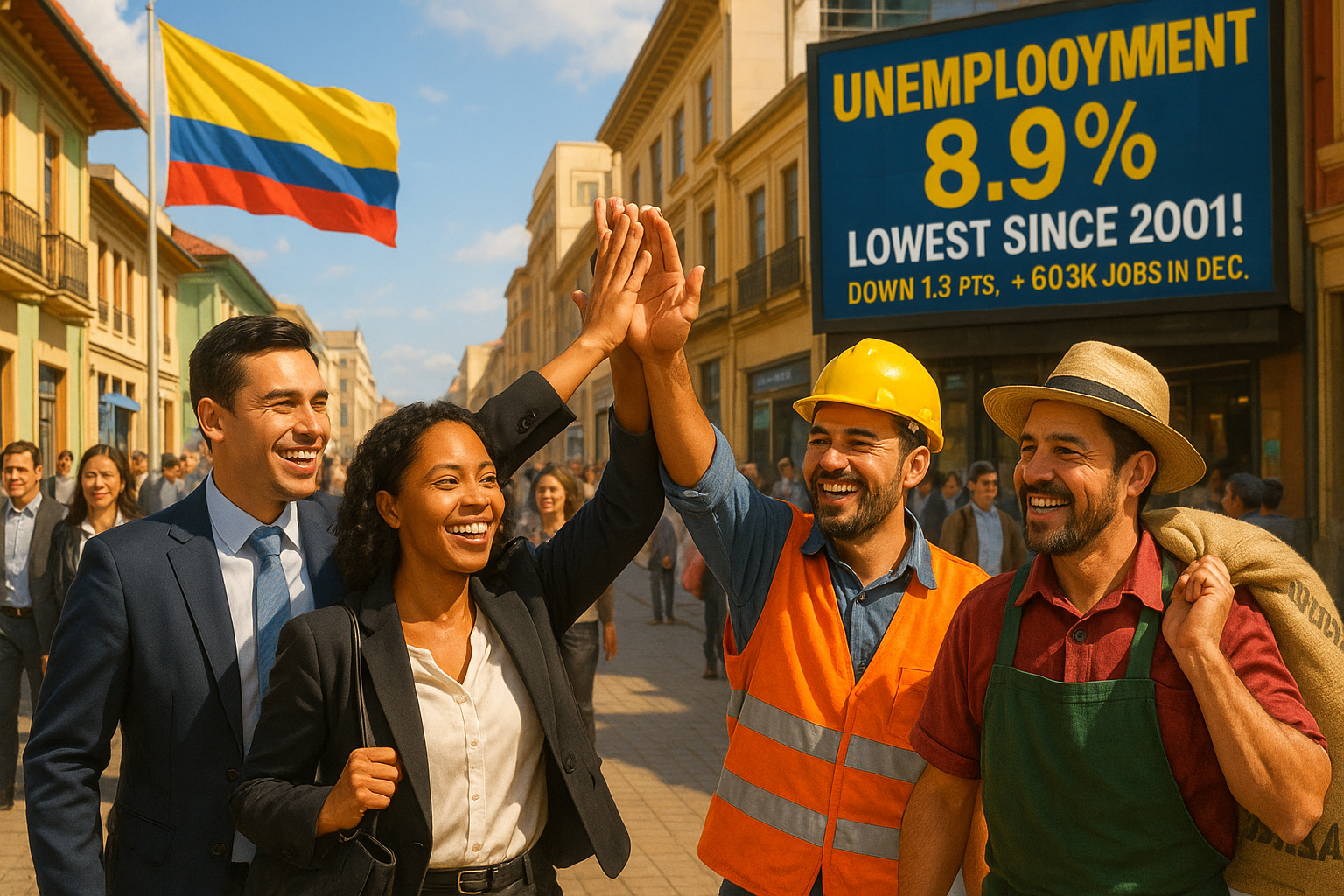Le Département administratif national de la statistique (DANE) de Colombie a rapporté que le taux de chômage pour 2025 était de 8,9 %, le plus bas depuis 2001. Ce chiffre marque une baisse de 1,3 point de pourcentage par rapport à 2024. En décembre 2025, le taux est tombé à 8 %, la population employée augmentant de 603 000 personnes.
