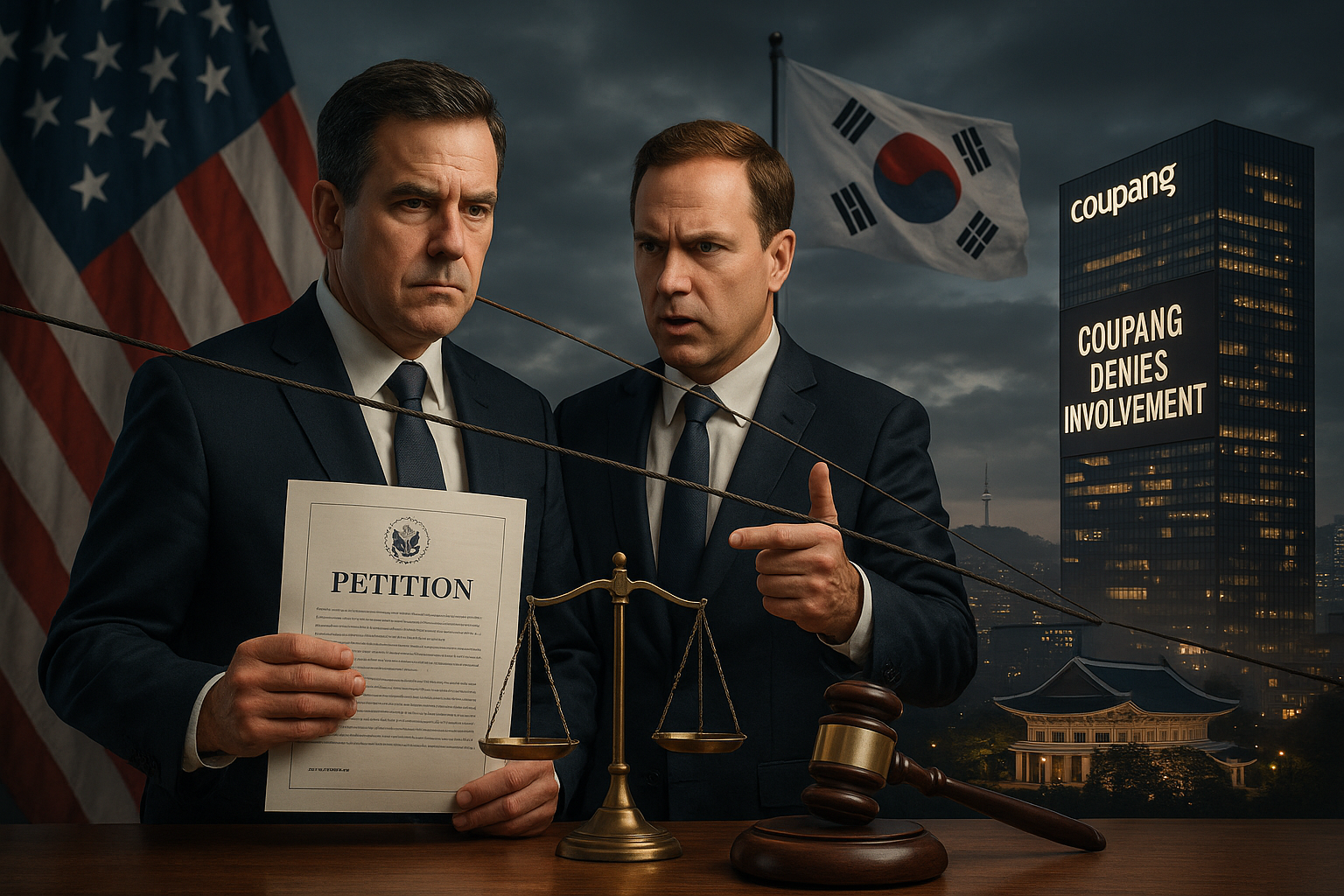 Dramatic illustration of U.S. investors petitioning against Seoul over alleged Coupang discrimination, as Coupang denies involvement.
