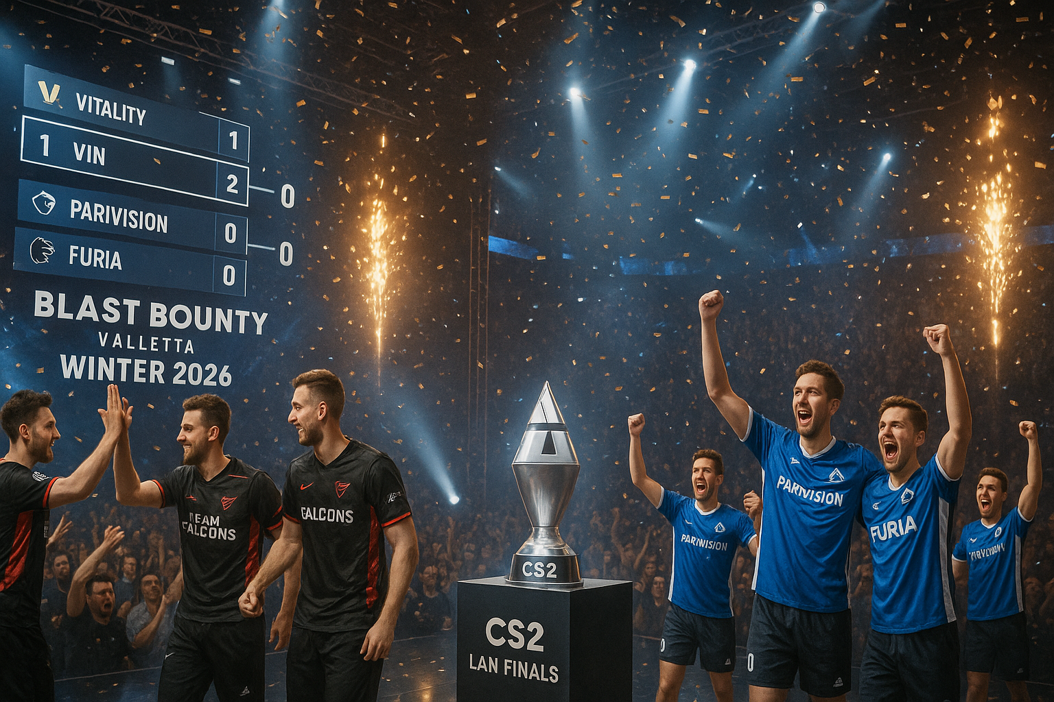 Team Falcons et PARIVISION ont réalisé de gros upsets en demi-finales des finales LAN BLAST Bounty Winter 2026 CS2, éliminant les favoris Vitality et FURIA respectivement. Falcons a battu Vitality 2-1, tandis que PARIVISION a gagné contre FURIA 2-0 dans une série tendue. La grande finale opposera ces underdogs pour le premier trophée CS2 de 2026 à Malte.