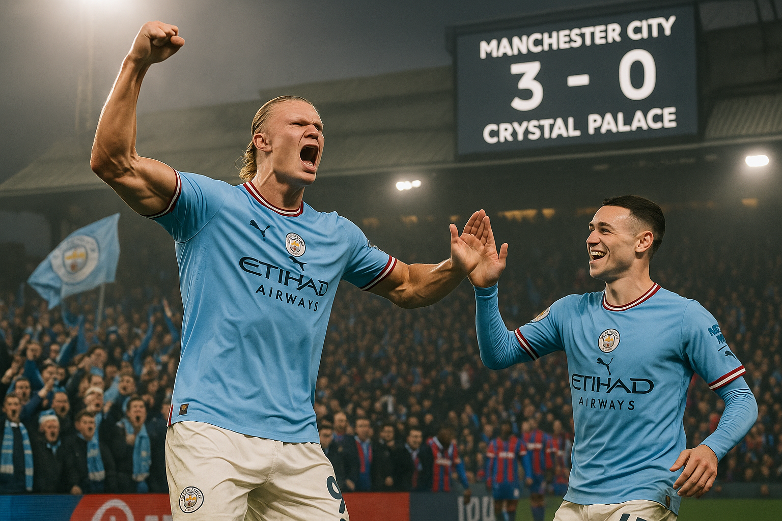 Erling Haaland a inscrit un doublé alors que Manchester City a sécurisé une victoire 3-0 contre Crystal Palace à Selhurst Park, se retrouvant à deux points des leaders Arsenal. Phil Foden a ajouté un but en seconde mi-temps, tandis que Palace a touché les montants deux fois sans trouver le chemin des filets. Cette victoire prolonge la forme solide de City en Premier League.