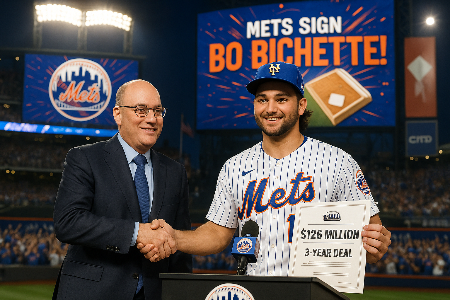 Bo Bichette in Mets jersey at press conference signing $126 million contract, with team executives and celebratory banner.