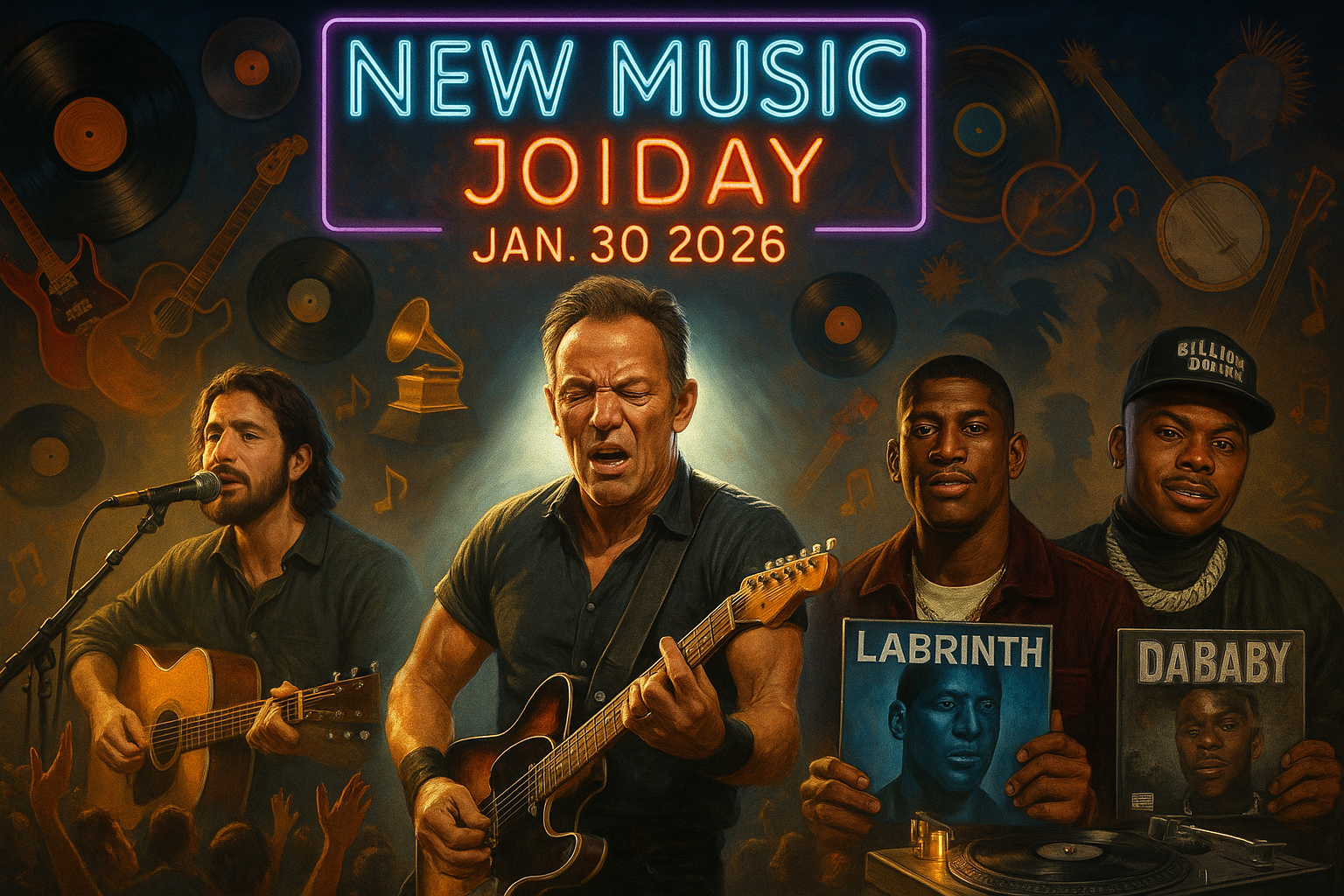Le 30 janvier 2026, New Music Friday a offert un large éventail d'albums et de singles dans divers genres, du rock et punk au hip-hop et country. Les points forts incluent la chanson de protestation de Bruce Springsteen, le single folk-rock de Noah Kahan, et de nouveaux projets d'artistes comme Labrinth et DaBaby. Ces sorties coïncident avec l'attente des Grammy, avec des hommages et de la nouvelle musique liée à l'événement.
