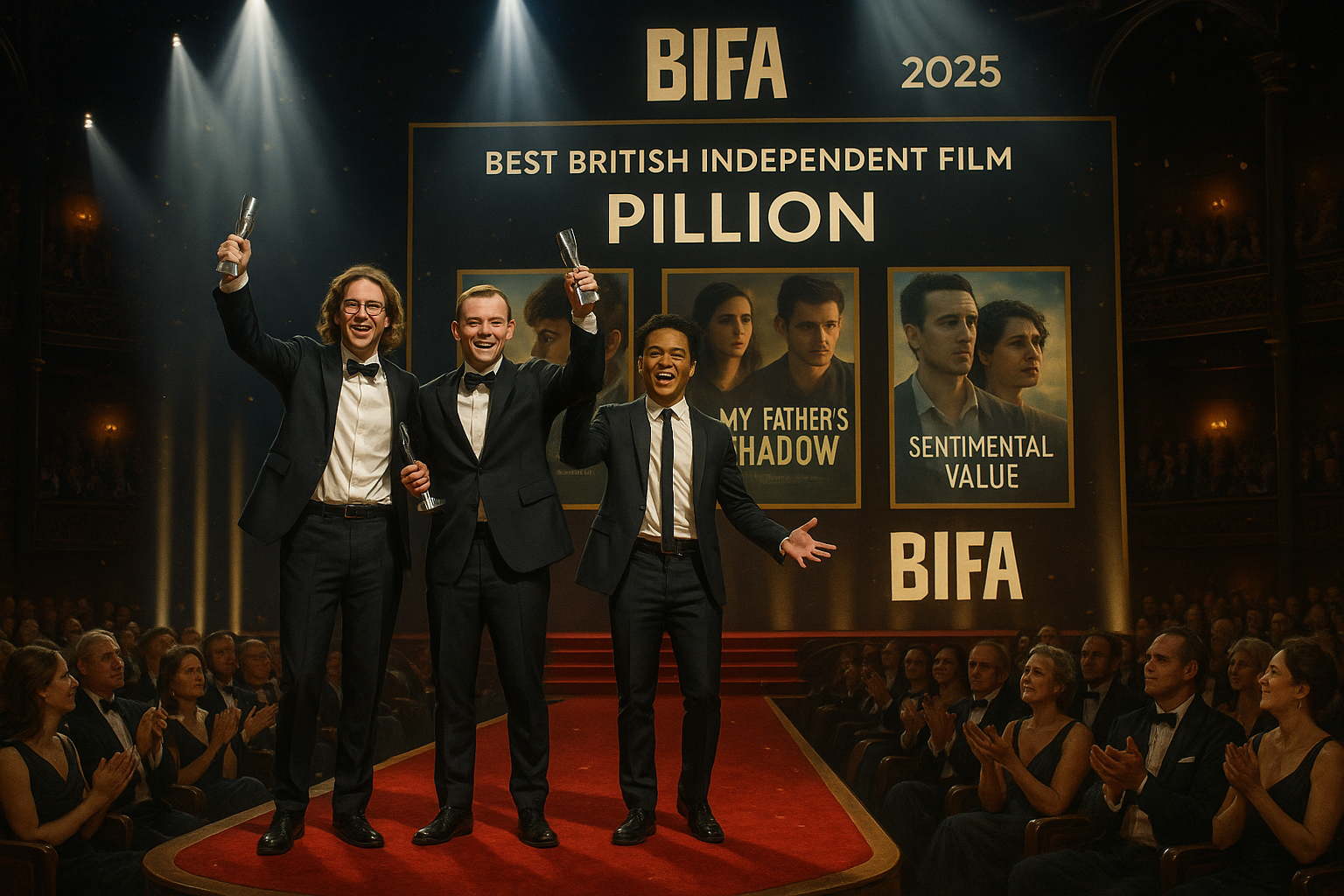 'Pillion', une romance BDSM réalisée par Harry Lighton, a décroché le prix le plus prestigieux de la soirée pour le meilleur film indépendant britannique. Le film, qui a fait sa première à Cannes début 2025 et est prévu pour une sortie aux États-Unis via A24, met en vedette Alexander Skarsgård en motard charismatique et Harry Melling en jeune homme timide attiré dans son monde. Il a également remporté le meilleur scénario de début pour Lighton, le meilleur design de costumes pour Grace Snell, et le meilleur maquillage et coiffure pour Diandra Ferreira. Celia Imrie a remis le prix du meilleur film indépendant britannique à l'équipe.