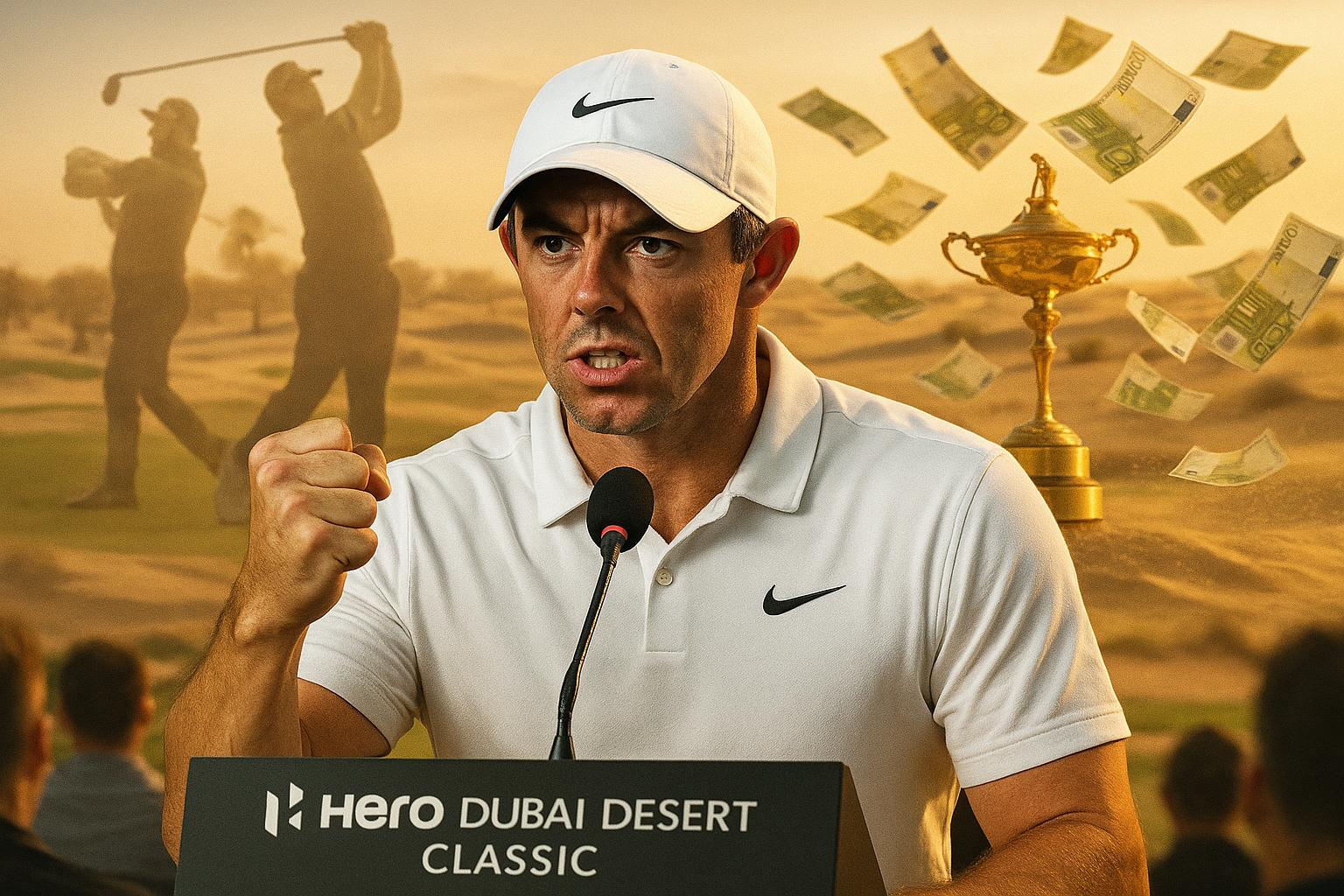 Rory McIlroy passionately urging LIV golfers like Rahm and Hatton to pay fines for Ryder Cup eligibility, symbolic desert golf scene.