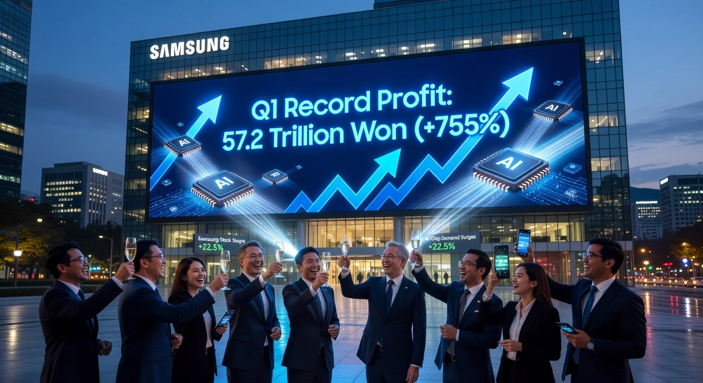 Illustration depicting Samsung Electronics' record Q1 operating profit of 57.2 trillion won driven by AI chip demand, featuring executives celebrating amid glowing financial displays.
