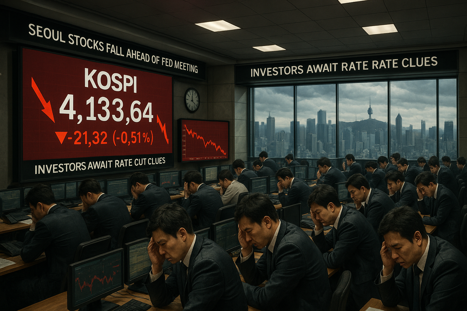Worried traders on the Seoul stock exchange floor monitor the falling KOSPI index ahead of the US Federal Reserve meeting.
