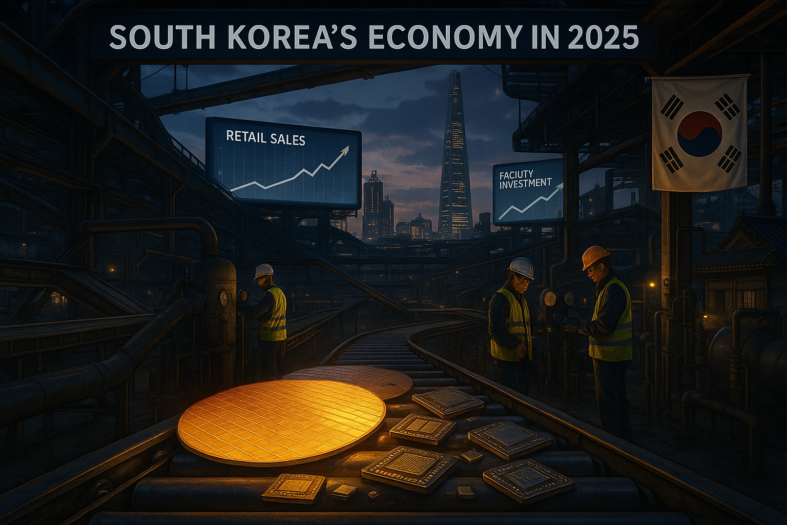 Realistic image depicting South Korea's slowing industrial output contrasted with strong semiconductors and improving retail investment, for 2025 economic news.