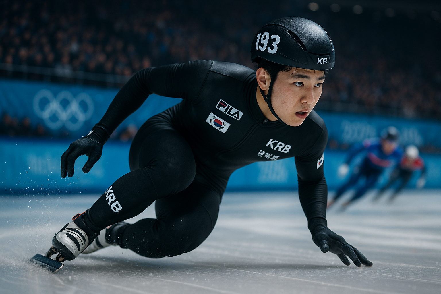South Korean teen speed skater Rim Jong-un racing dynamically on ice, a rising star for the 2026 Olympics.