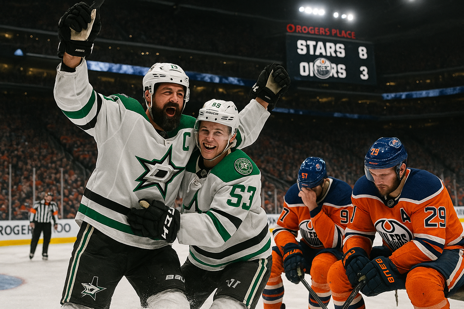 Les Dallas Stars ont dominé les Edmonton Oilers 8-3 mardi 25 novembre 2025 à Rogers Place à Edmonton, marquant la deuxième défaite écrasante des Oilers pour la saison 2025-26. Dallas, porté à 14-5-4 avec sa septième victoire en neuf matchs, a pris les devants 4-0 dès la première période. Jamie Benn a ouvert le score à 3:48 avec son 400e but en NHL, assisté par Wyatt Johnston, qui a terminé avec un but et trois passes. Roope Hintz a ajouté un but en avantage numérique à 10:51, Nathan Bastian a marqué à 15:24 et Sam Steel a porté le score à 4-0 à 18:46 sur une erreur de Mattias Ekholm.