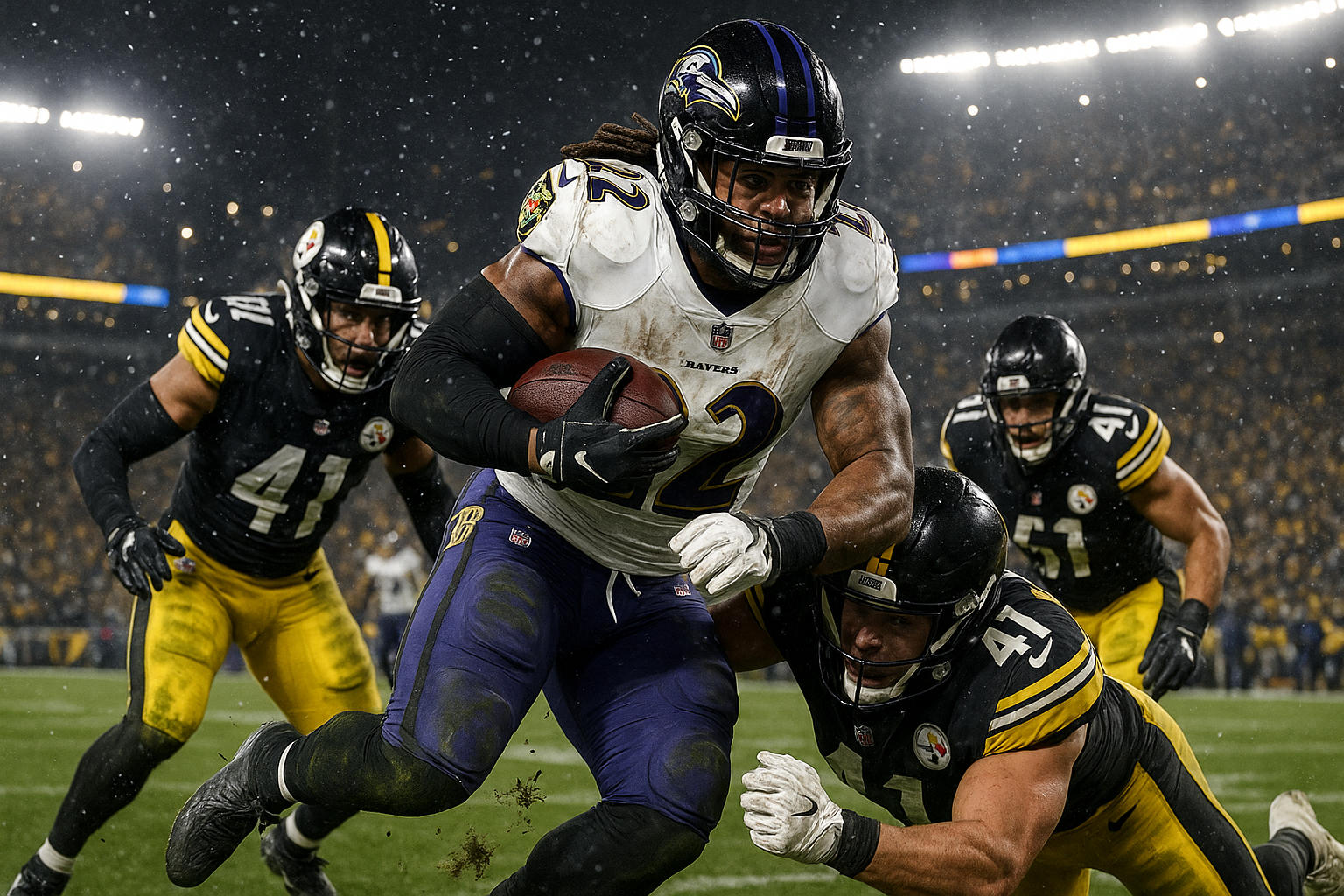 Dramatic illustration of Steelers vs. Ravens AFC North finale, Derrick Henry rushing against Steelers defense under night lights.