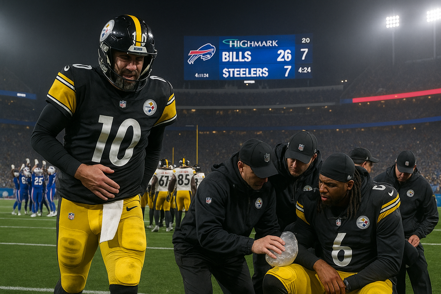 Les Pittsburgh Steelers ont subi une défaite 26-7 face aux Buffalo Bills lors de la semaine 13, marquée par des blessures de joueurs clés Aaron Rodgers et Patrick Queen. Rodgers est sorti brièvement après un strip sack en seconde mi-temps, tandis que Queen a été déclaré out pour une blessure à la hanche plus tôt dans le match. Cette perte ramène Pittsburgh à 6-6, à une demi-partie des Baltimore Ravens dans la AFC North.