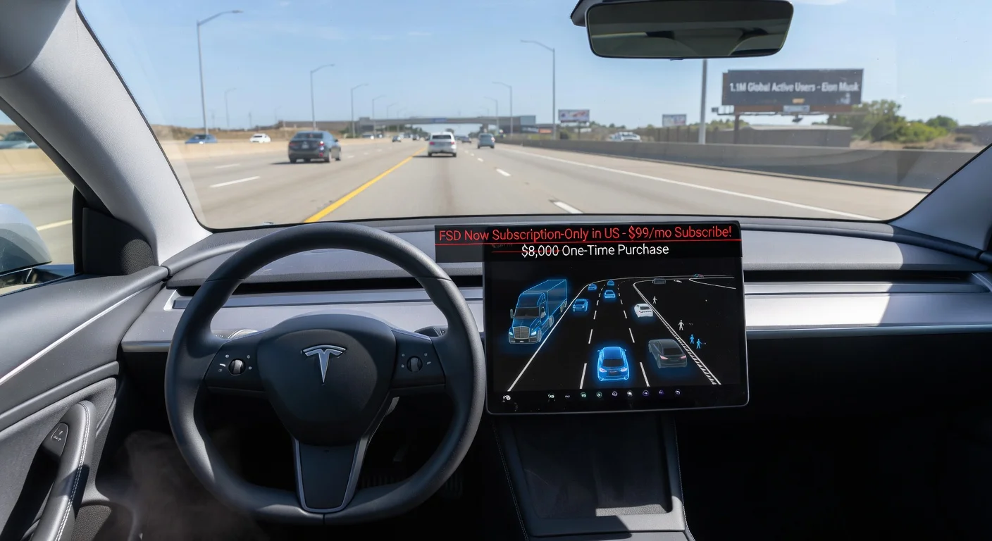 Tesla a pleinement transitionné sa suite Full Self-Driving (FSD) vers un modèle par abonnement uniquement aux États-Unis, supprimant l'option d'achat unique de 8 000 $ pour la plupart des véhicules. L'annonce de janvier du PDG Elon Musk a pris effet le week-end du 14-16 février 2026, après l'étape récente d'1,1 million d'utilisateurs actifs mondiaux. Une faille restreinte du forfait Luxe subsiste pour les modèles haut de gamme.