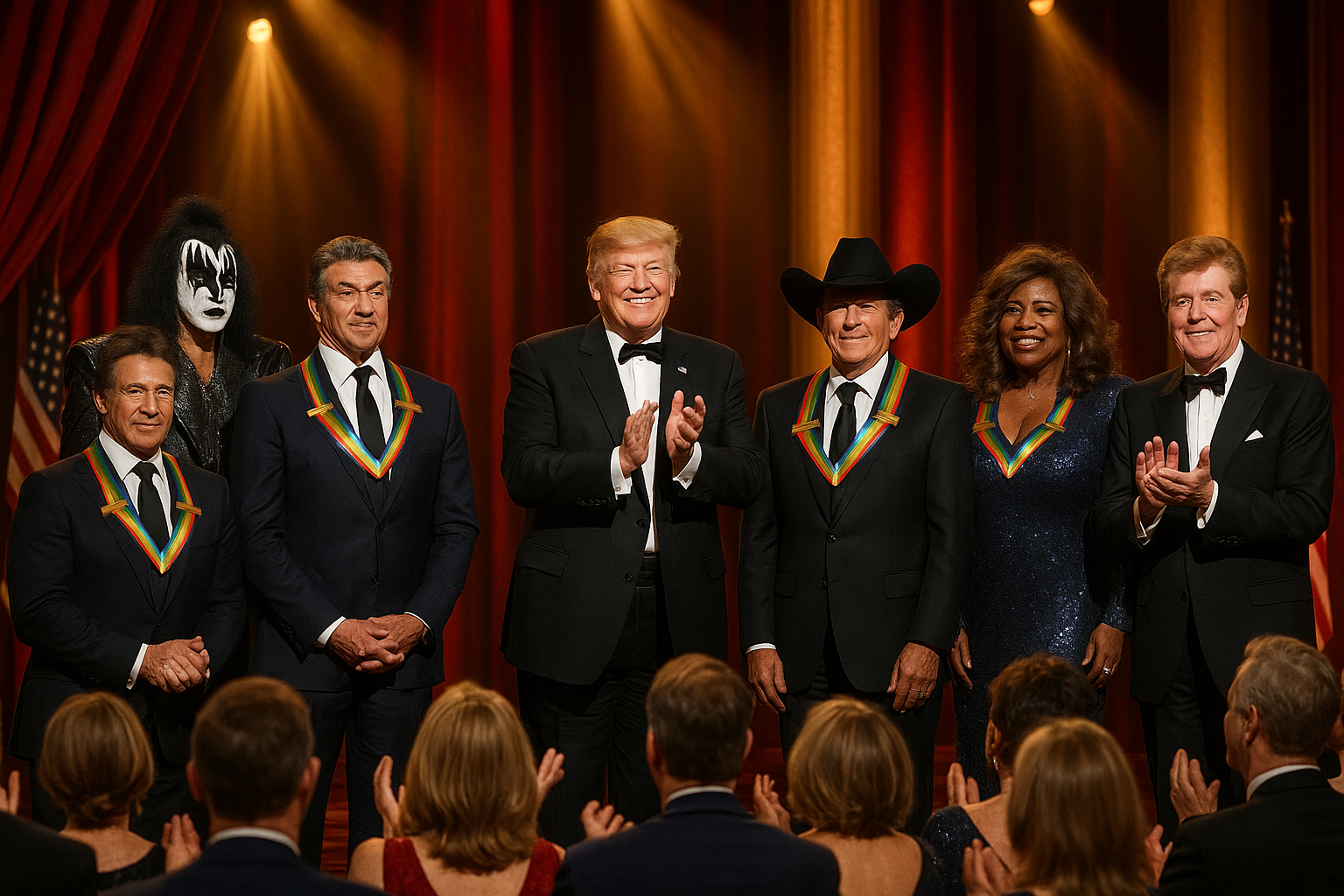 President Donald Trump hosts the 2025 Kennedy Center Honors on stage with honorees Sylvester Stallone, KISS, George Strait, Gloria Gaynor, and Michael Crawford.
