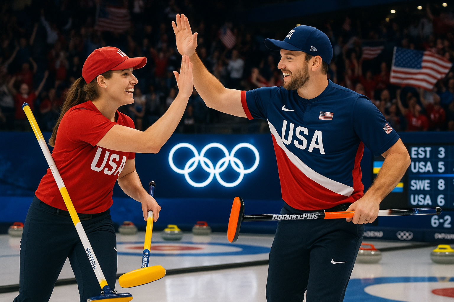 U.S. curlers Cory Thiesse and Korey Dropkin high-five on Olympic ice after victories over Norway and Switzerland.