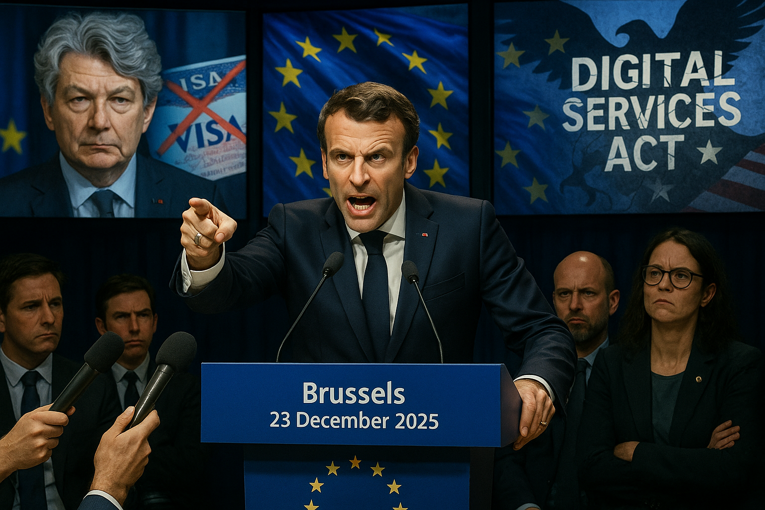 Le 23 décembre 2025, l'administration Trump a annoncé des restrictions de visa contre cinq Européens, dont l'ancien commissaire européen au Marché intérieur Thierry Breton, en les qualifiant d'«idéologues» orchestrant une «censure extraterritoriale» contre les plateformes américaines. Ces sanctions s'inscrivent dans le sillage d'une amende de 120 millions d'euros infligée début décembre à X, le réseau social d'Elon Musk, pour non-respect du DSA, un règlement européen adopté en 2022 pour imposer une vigilance accrue contre les contenus illicites et la désinformation.