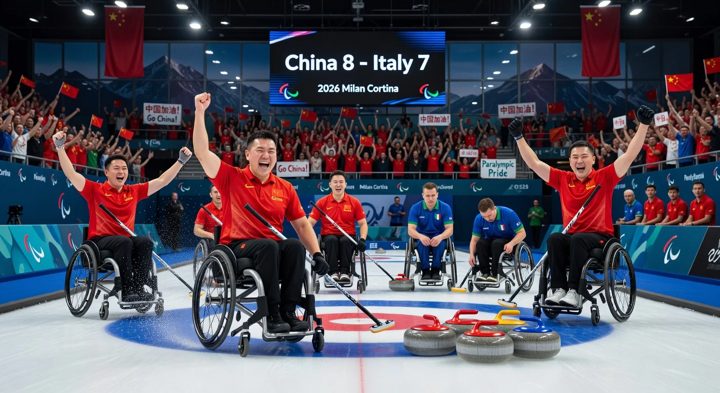 Chinese wheelchair curlers celebrate narrow 8-7 win over Italy, preserving unbeaten record at Milan Cortina Paralympics.