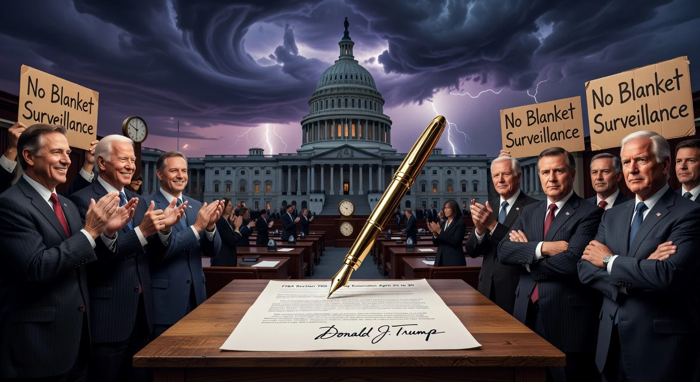 Illustration of US Capitol with divided lawmakers and President Trump signing FISA Section 702 extension amid deadline tension.