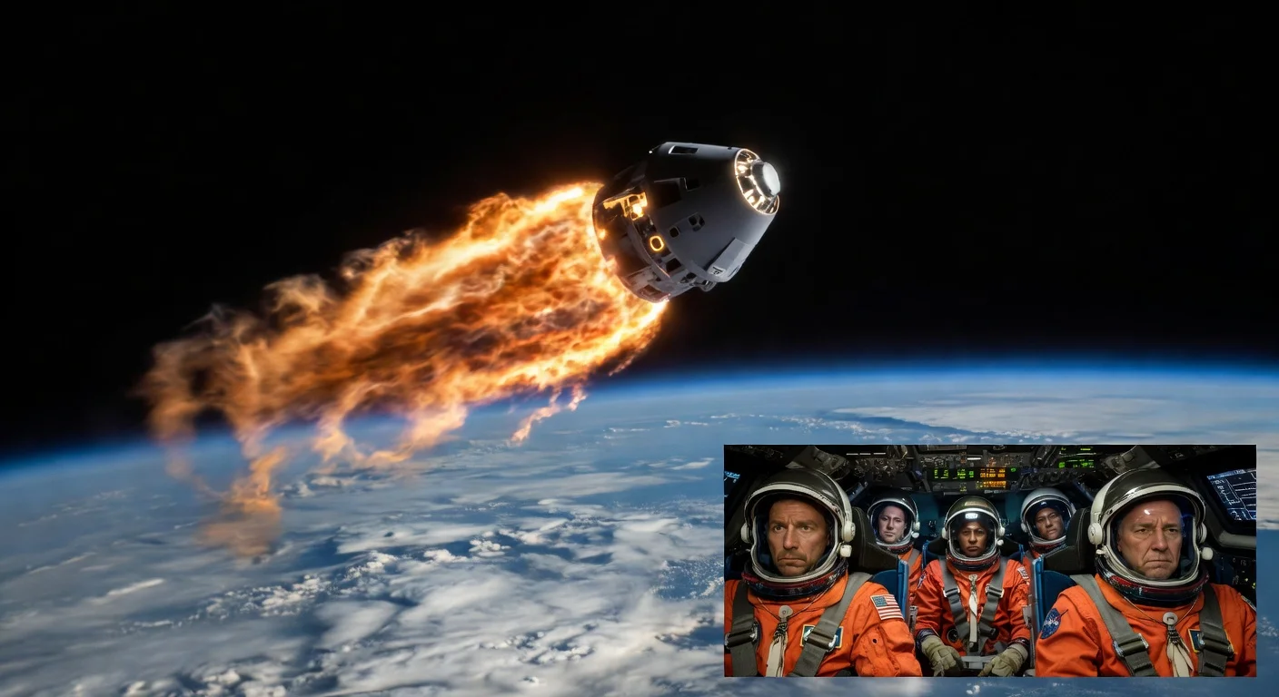 Orion spacecraft from Artemis 2 reentering Earth's atmosphere in fiery plasma glow, with inset of astronauts preparing for splashdown.