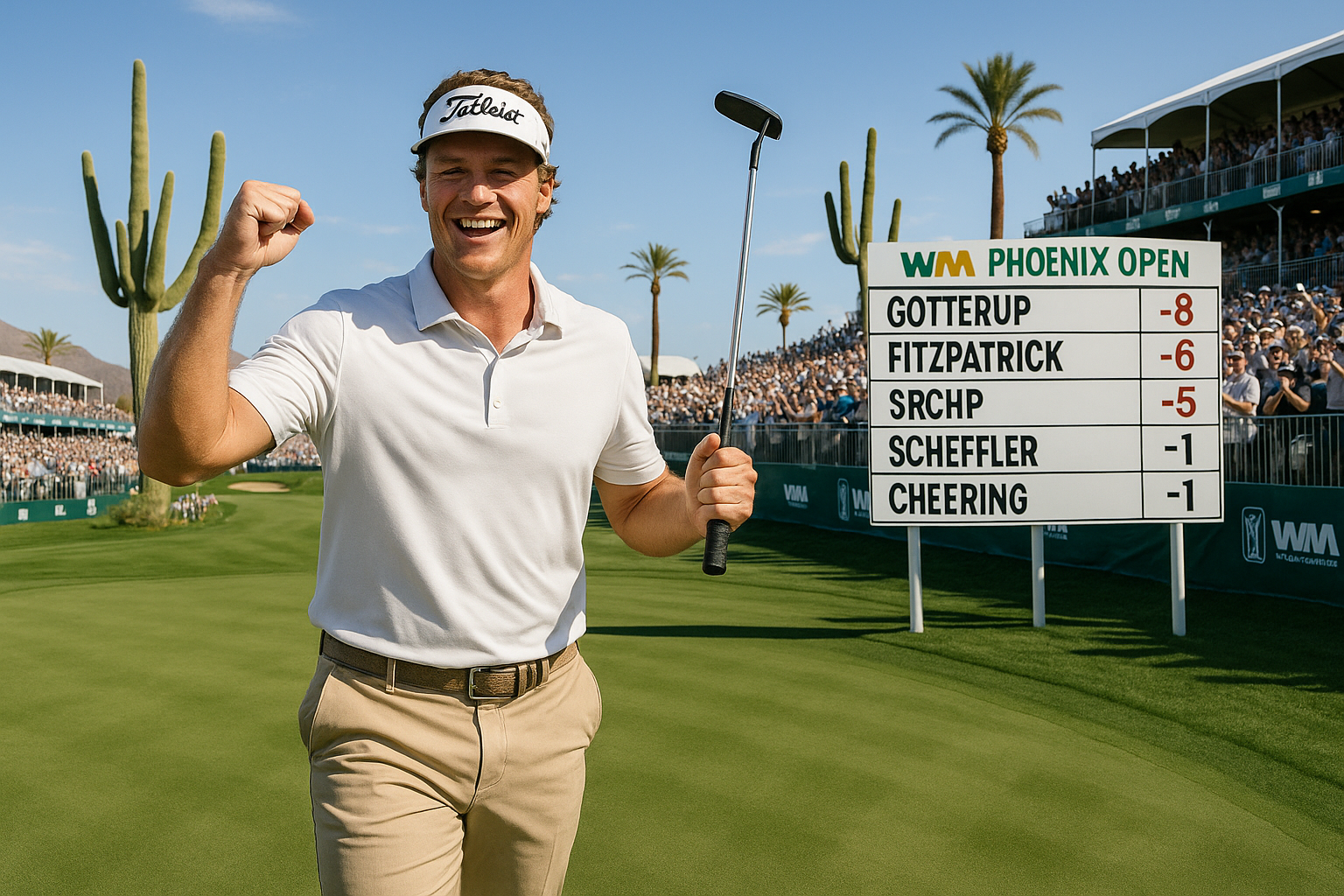 Chris Gotterup celebrates his first-round lead with an 8-under 63 at the WM Phoenix Open, ahead of Matt Fitzpatrick and a struggling Scottie Scheffler.
