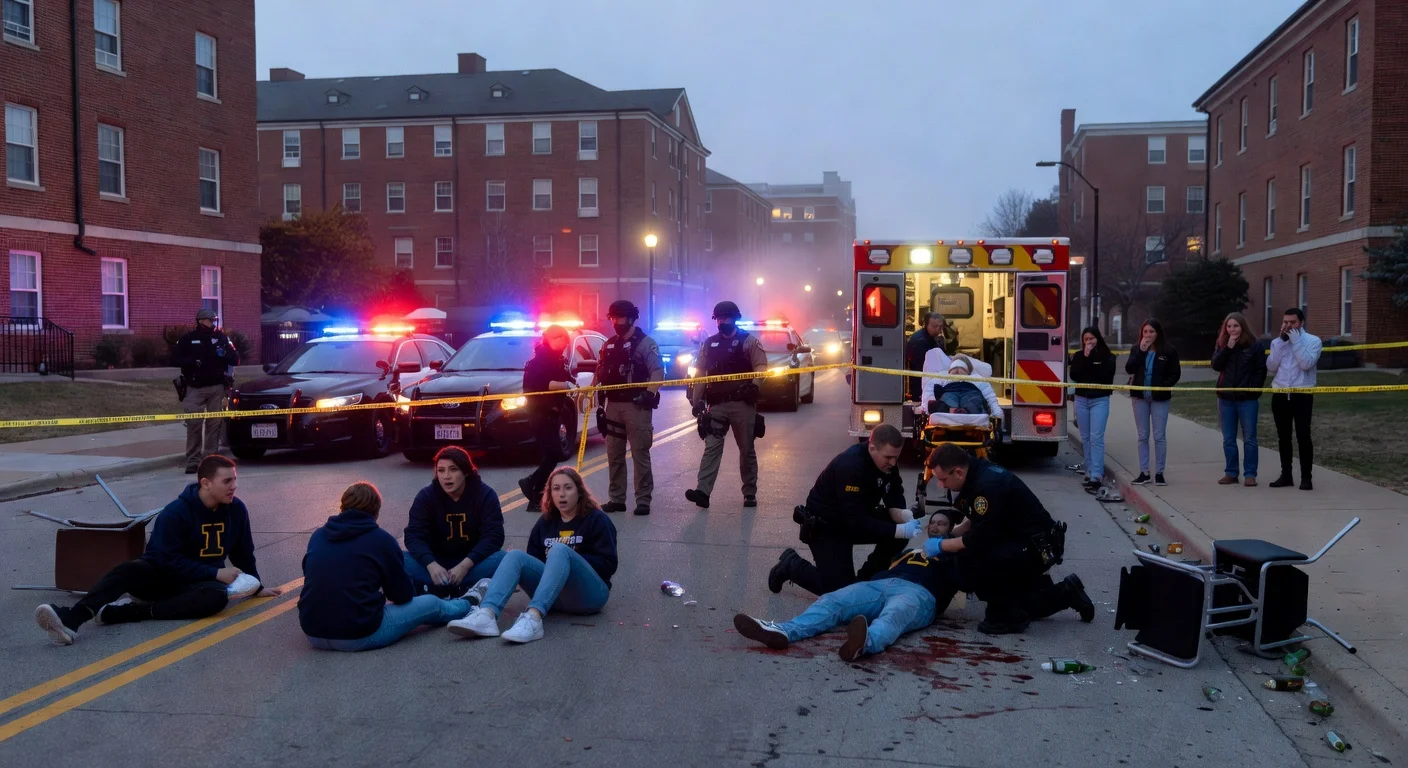 Emergency response to a shooting near University of Iowa campus: police lights flash amid injured students on the street at dawn.