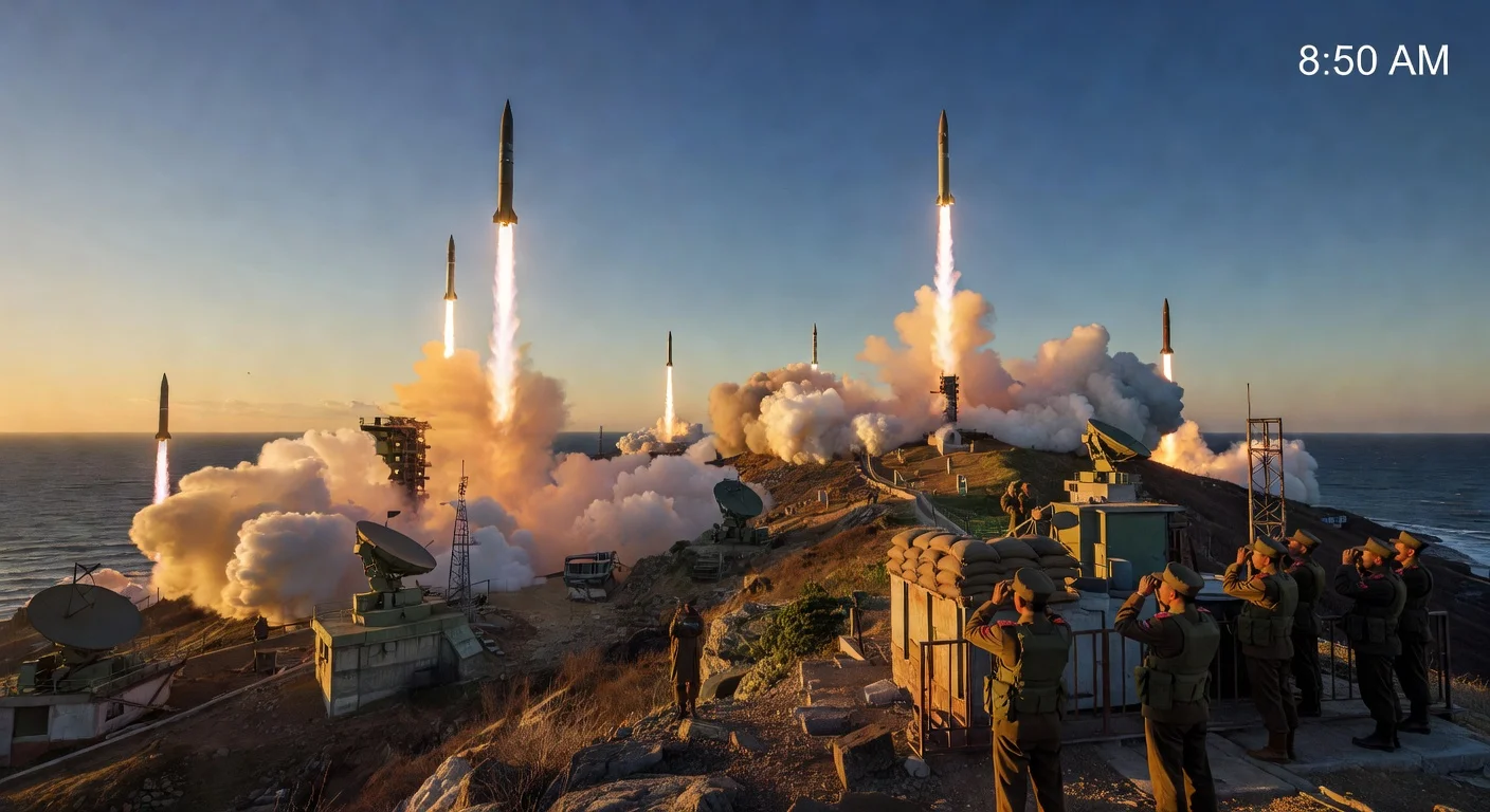 Photorealistic illustration of North Korean ballistic missiles launching toward the East Sea at dawn, with contrails streaking the sky.