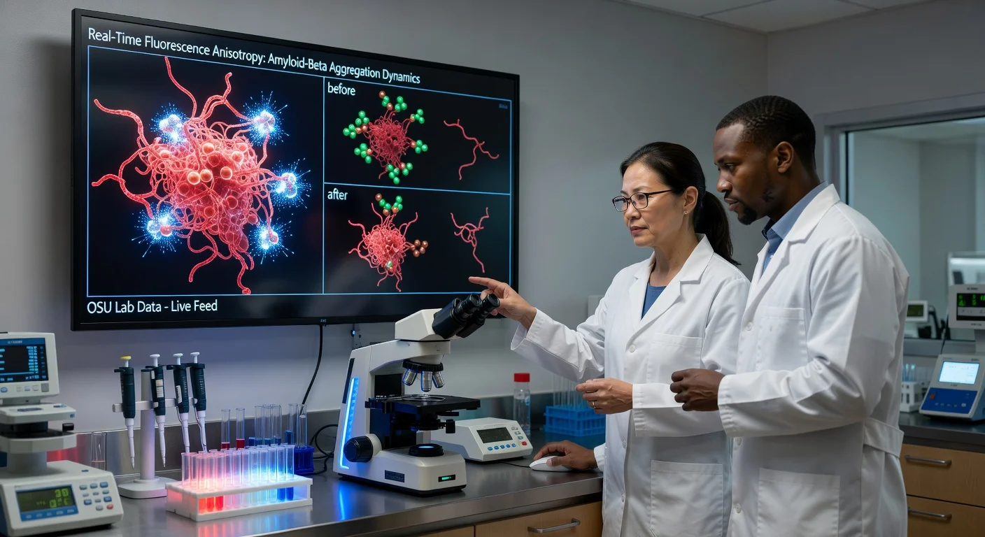 Oregon State scientists tracking copper-driven amyloid-beta clumping in real time using fluorescence anisotropy, with chelators reversing aggregation, in a high-tech lab.