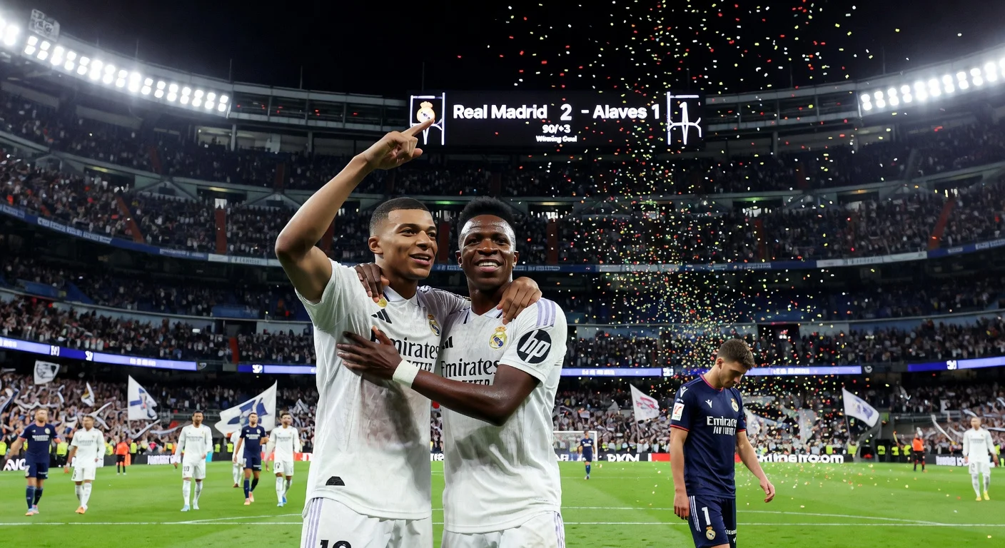 Real Madrid secured a 2-1 victory over Alaves at the Santiago Bernabeu, reducing Barcelona's lead at the top of LaLiga to six points. Kylian Mbappe and Vinicius Junior scored for the hosts, with Toni Martinez netting a late consolation for the visitors. The win ends Madrid's four-match winless streak across all competitions.