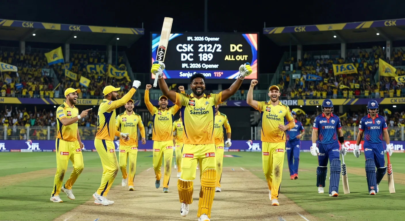 चेन्नई सुपर किंग्स ने आईपीएल 2026 में अपनी पहली जीत दर्ज की, जब संजू सैमसन ने चेपॉक में दिल्ली कैपिटल्स के खिलाफ नाबाद 115 रन की पारी खेली। सीएसके ने 212/2 का स्कोर बनाया और डीसी को 23 रन से हरा दिया। जेमी ओवरटन ने 4 विकेट लिए।