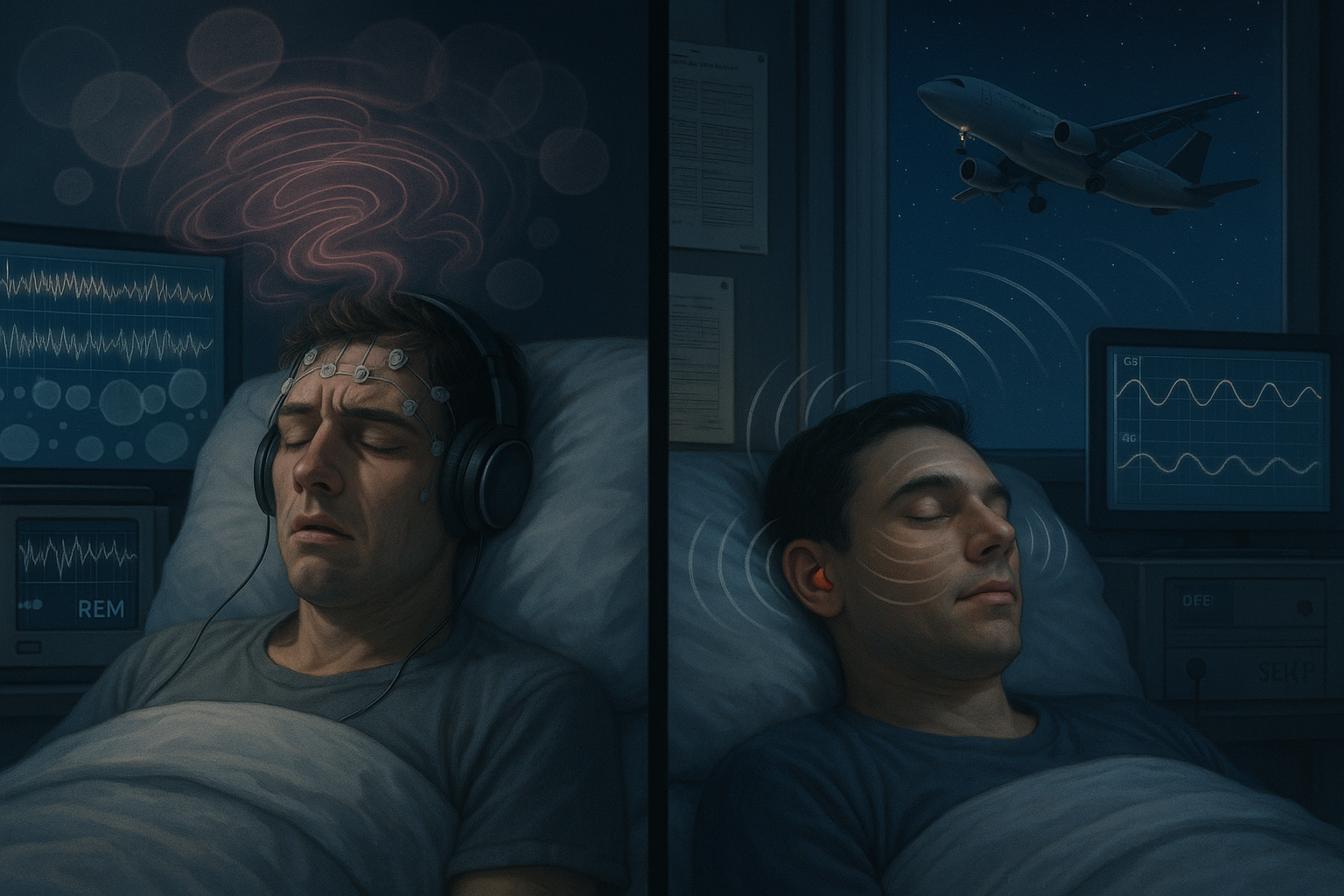 Realistic split-scene illustration of UPenn sleep study: pink noise disrupting REM sleep via headphones on left, earplugs shielding deep sleep from airplane noise on right.
