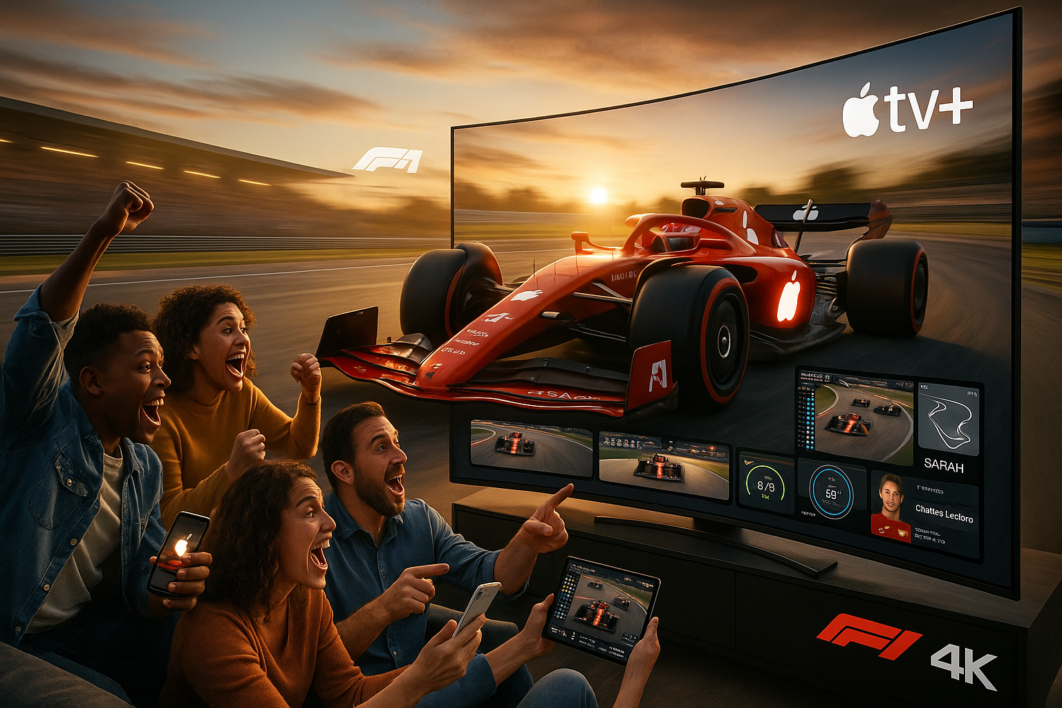 Dynamic illustration of Apple TV+ exclusively streaming Formula 1 races in stunning 4K from 2026, with racing action and immersed fans.