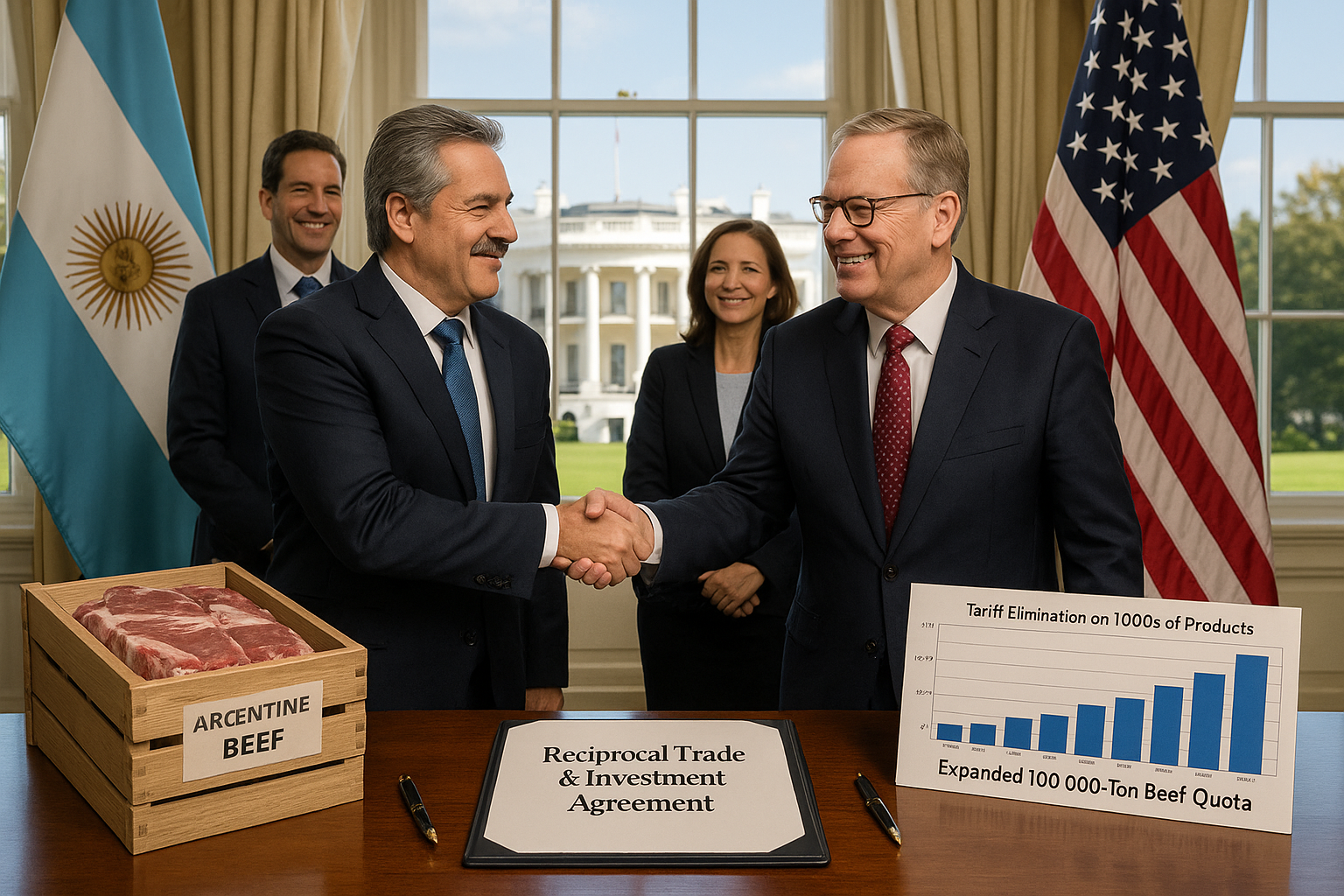 Argentine and US officials shake hands sealing trade deal expanding beef exports to 100,000 tons.