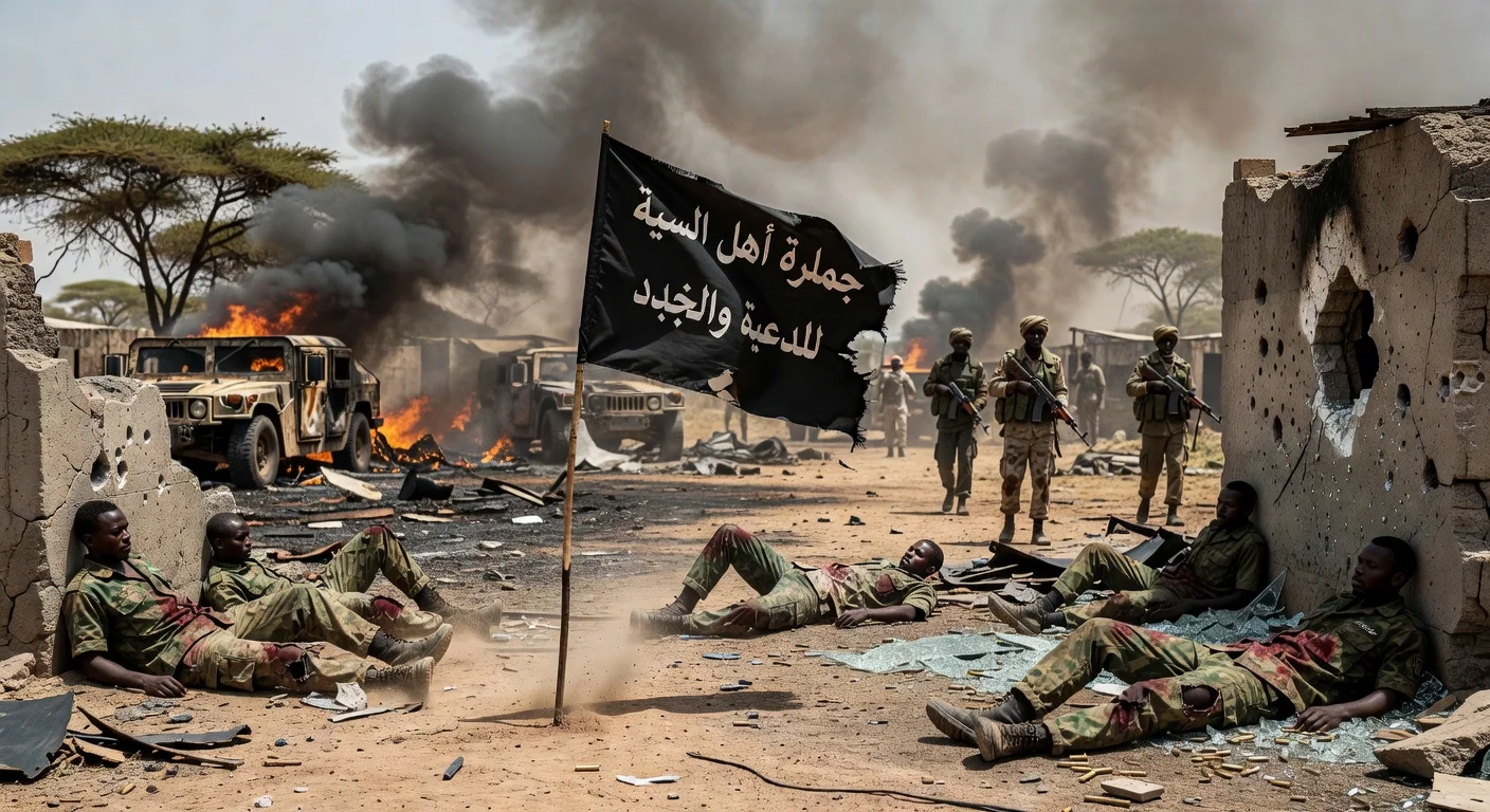 Dramatic photo illustration depicting the aftermath of a Boko Haram attack on a military base in Borno State, Nigeria, with smoke, debris, and militants' flag.