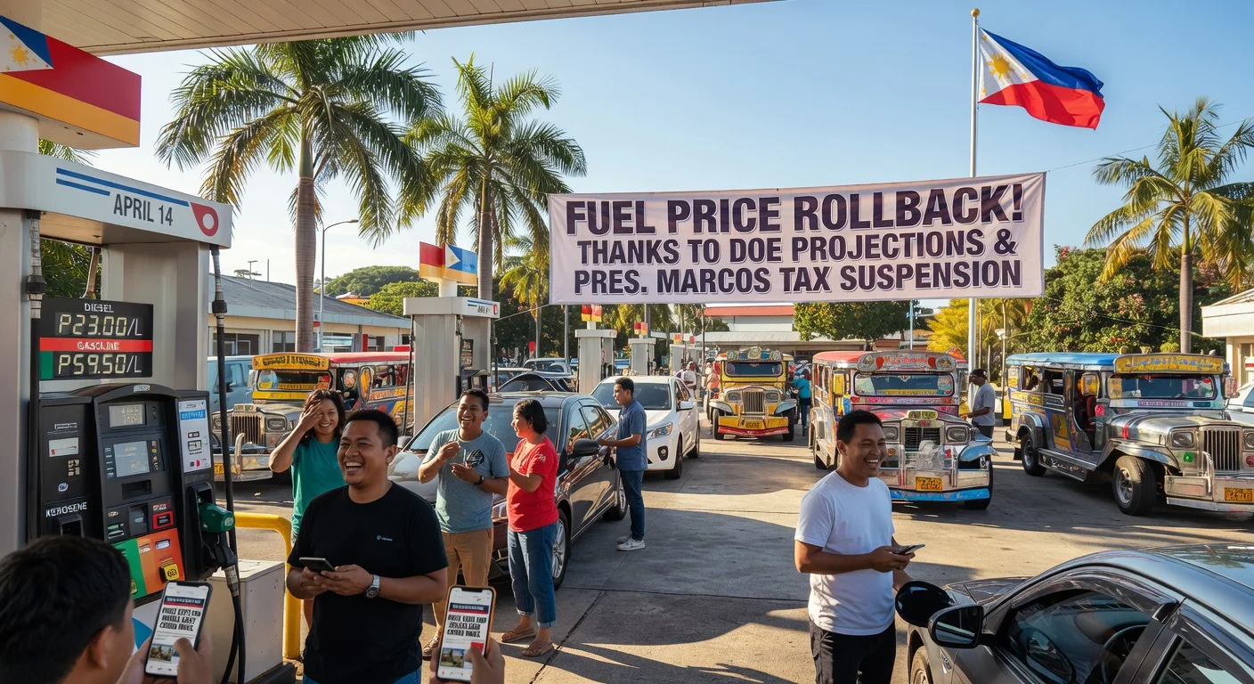 Oil firms confirmed price rollbacks effective 6 a.m. Tuesday, April 14, matching Department of Energy projections: diesel down P20.89 to P23 per liter, gasoline P4.43 to P4.50, and kerosene P8.50. The cuts end surges of over P100 on diesel since late February's Middle East crisis. President Marcos suspended excise taxes on LPG and kerosene, while a jeepney subsidy launches.
