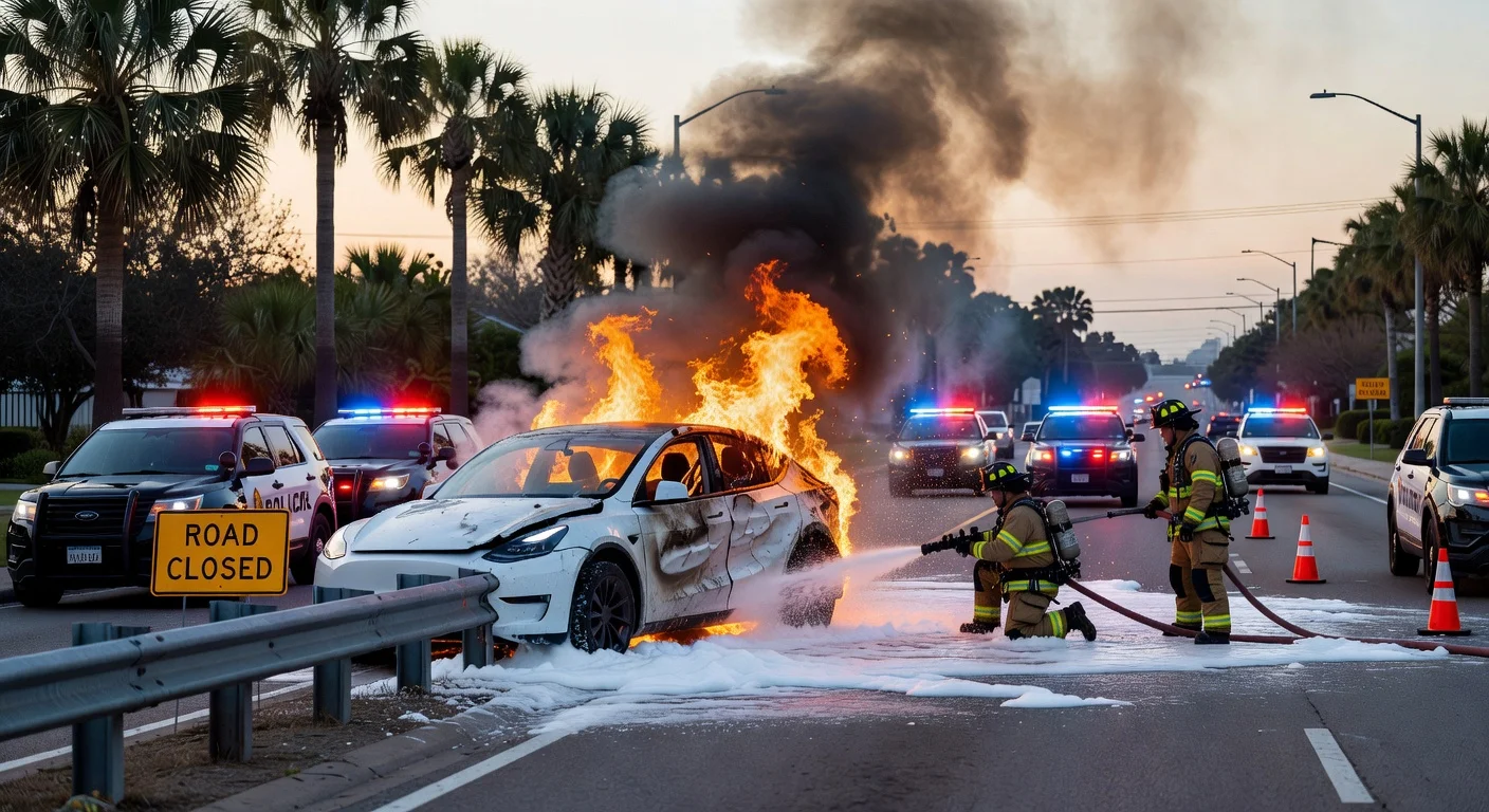 Sebuah kendaraan Tesla kecelakaan di Ennis Joslin Road dekat Alameda Street di Corpus Christi, Texas, pada dini hari 16 Februari 2026, menyebabkan kebakaran dan penutupan jalan sementara. Tidak ada laporan cedera, meskipun petugas darurat menghadapi tantangan memadamkan api baterai litium kendaraan listrik tersebut. Pihak berwenang sedang menyelidiki penyebab insiden satu kendaraan.