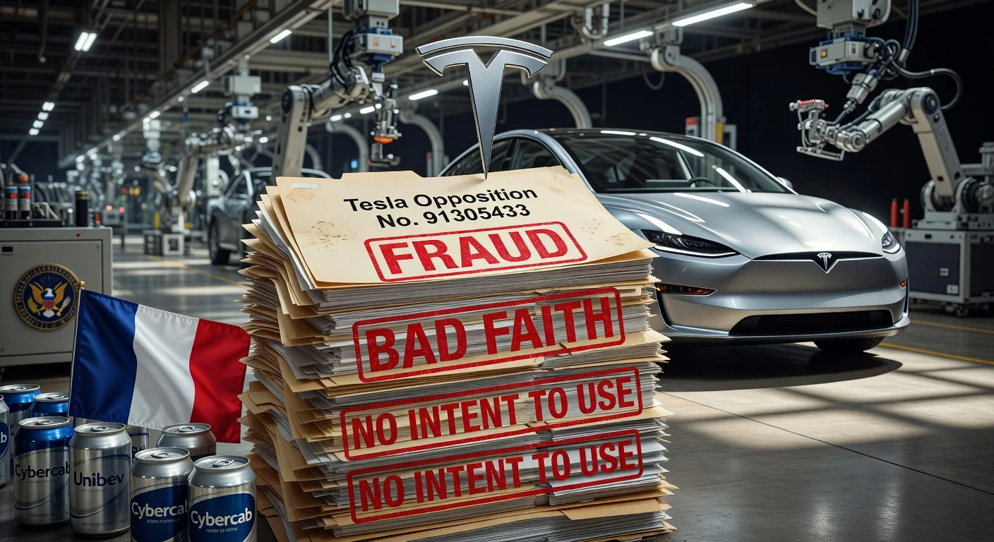 Tesla mengajukan penentangan terperinci 167 halaman (No. 91305433) ke Kantor Paten dan Merek Dagang AS pada 18 Februari 2026, terhadap permohonan merek 'Cybercab' (Serial No. 79/412,082) perusahaan minuman Prancis Unibev, menuduh penipuan, itikad buruk, dan tidak ada niat penggunaan asli. USPTO memberi tahu Unibev pada 24 Februari, memberi waktu 60 hari untuk merespons atau menghadapi putusan default. Sengketa ini muncul saat Tesla mempercepat produksi robotaxi $30.000 menjelang produksi massal pada April 2026.