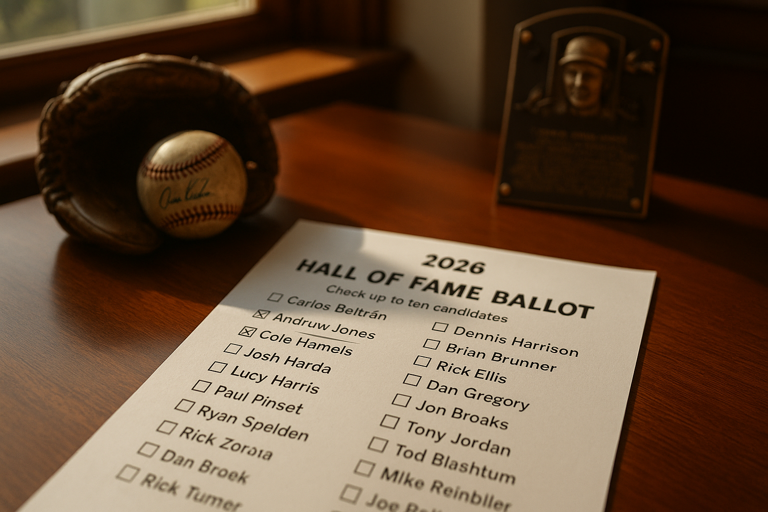 Photo illustration of the 2026 Baseball Hall of Fame ballot featuring key candidates like Carlos Beltrán, Andruw Jones, and Cole Hamels, surrounded by baseball memorabilia.