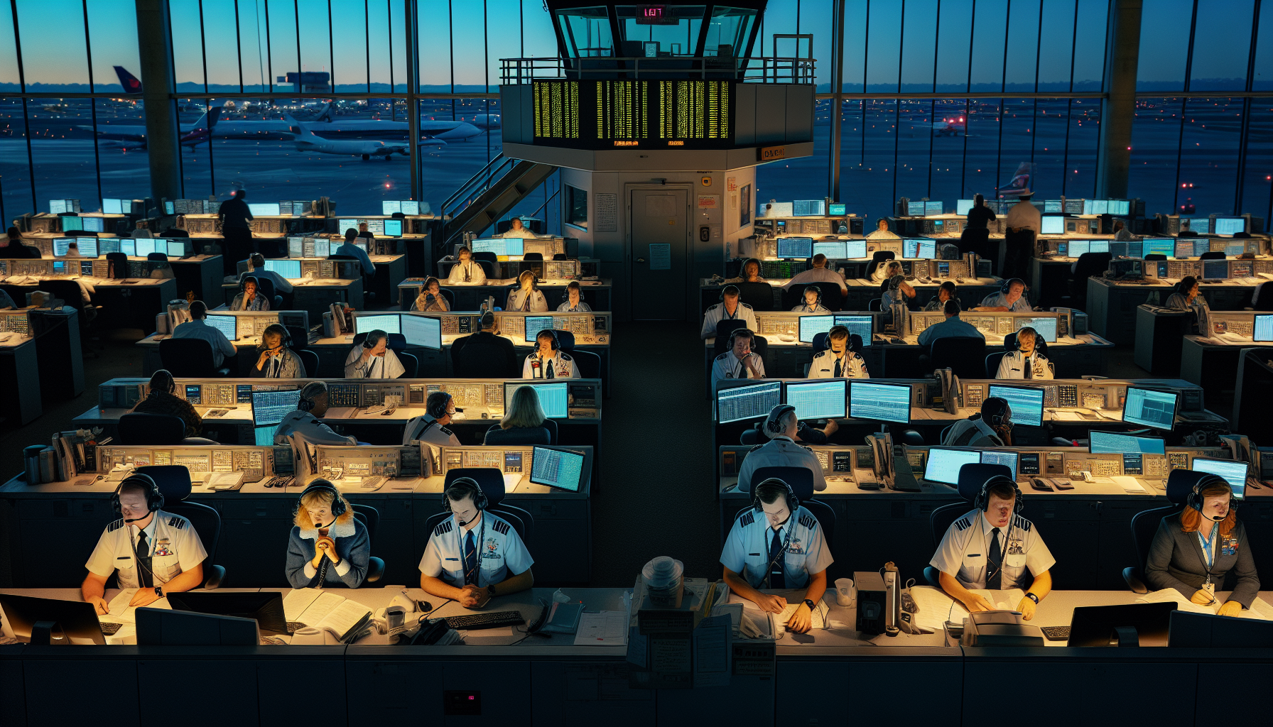 Stressed air traffic controllers in a understaffed control tower during U.S. government shutdown, with delayed planes on the tarmac below.