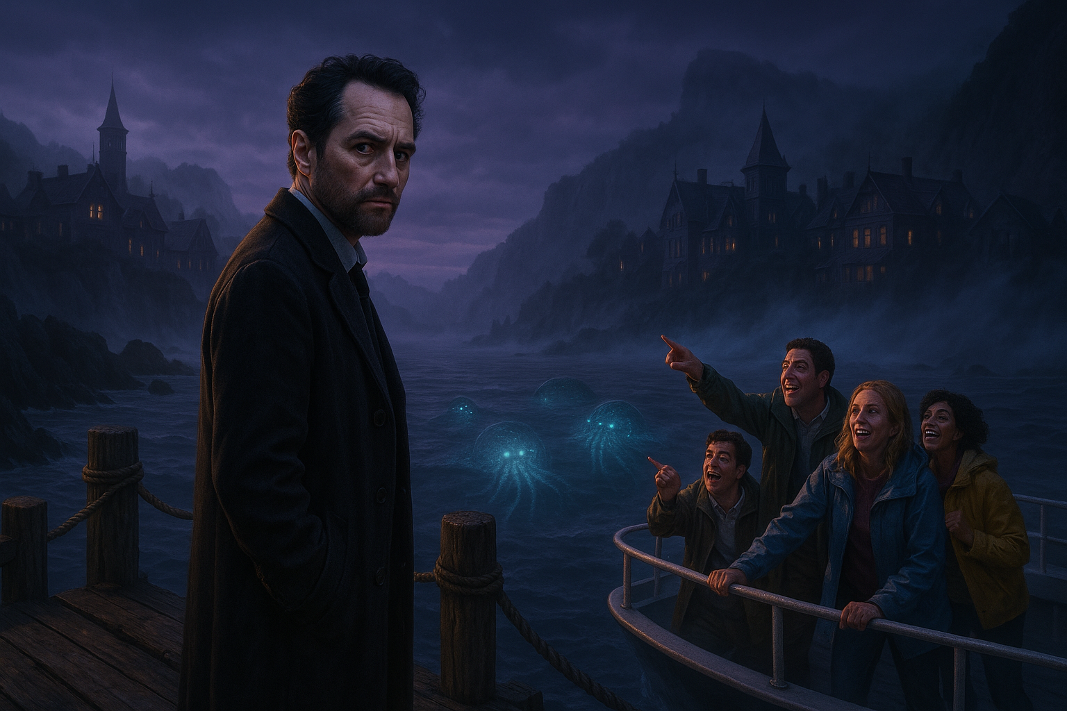 First-look illustration of Apple TV's 'Widow’s Bay' horror comedy series, starring Matthew Rhys as the mayor of a cursed island town where tourists awaken ancient legends.