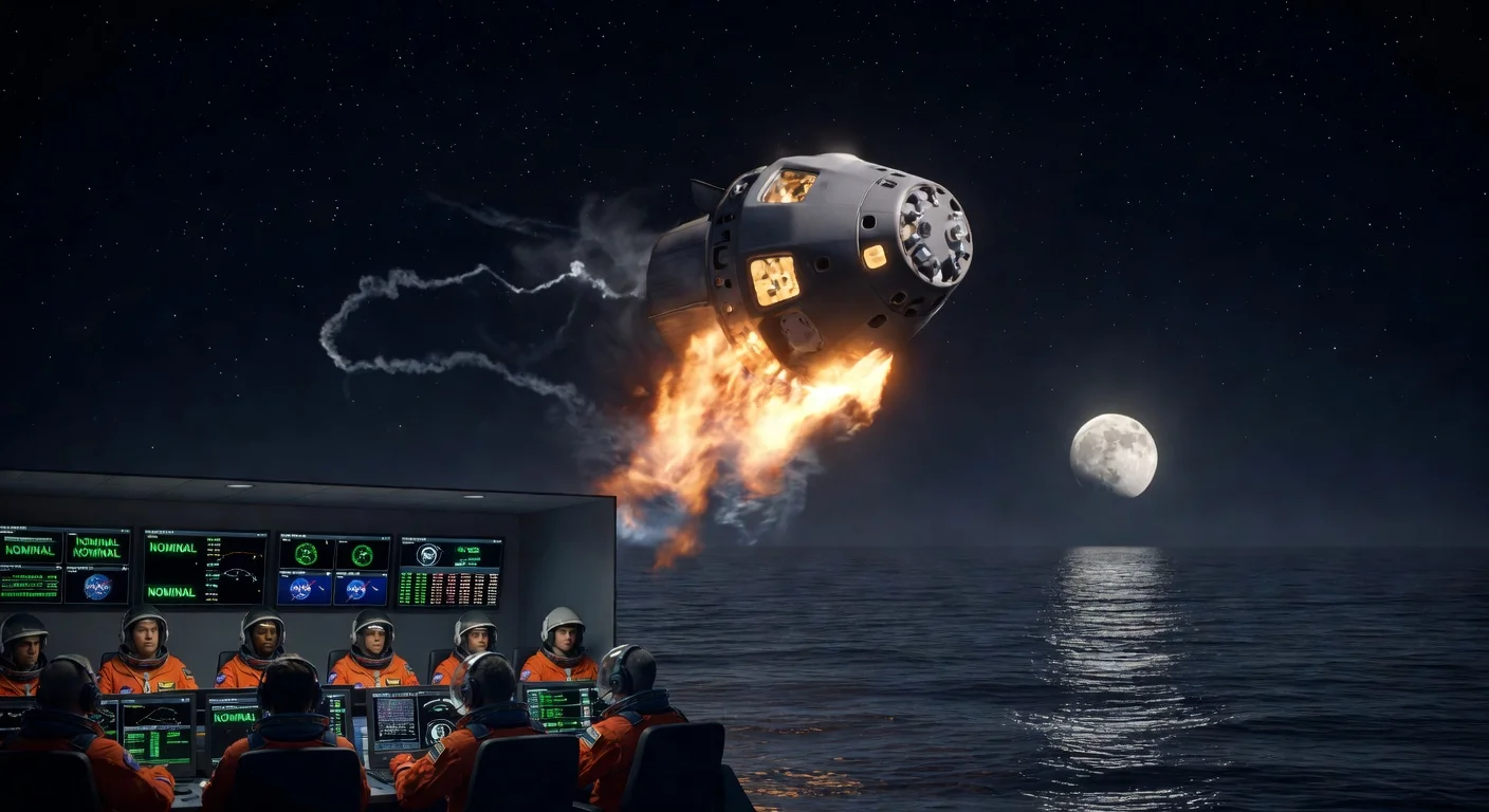 Illustration depicting NASA's Orion spacecraft on safe reentry path during Artemis II mission after detecting helium leak, with crew visible and mission control monitoring.