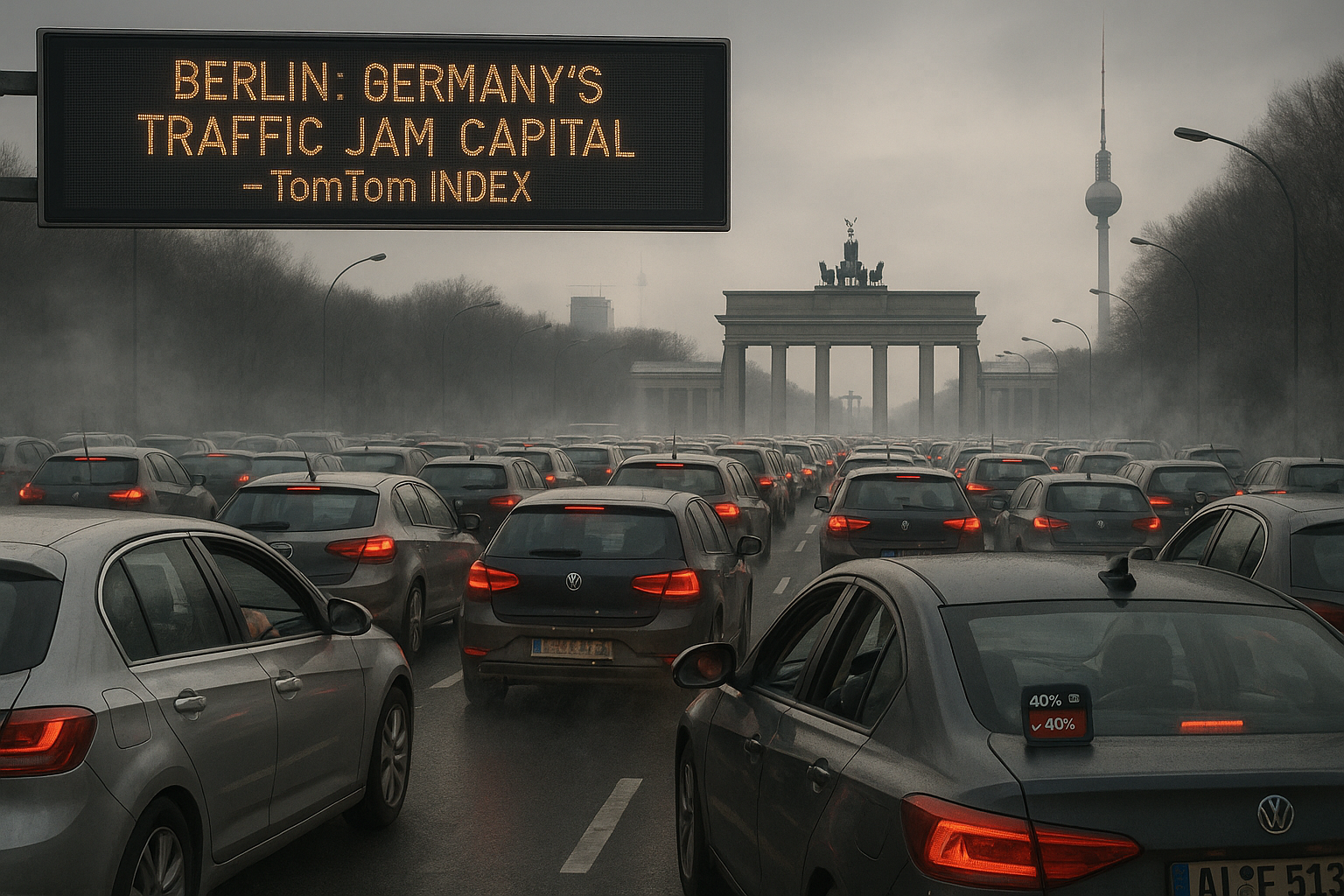 Realistic scene of massive traffic congestion on Berlin highway with Brandenburg Gate in background, illustrating city's top ranking in TomTom traffic jam index.