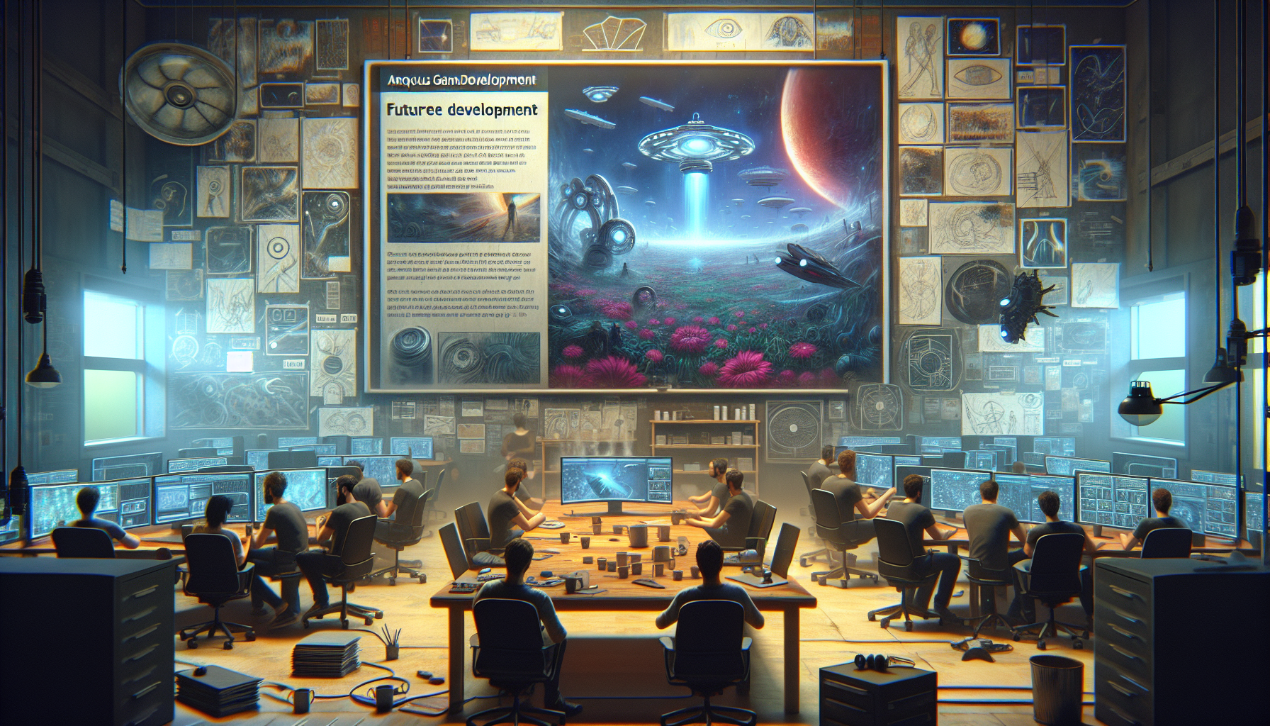 Illustration of BioWare developers reviewing N7 Day blog post on Mass Effect development in a modern office setting.