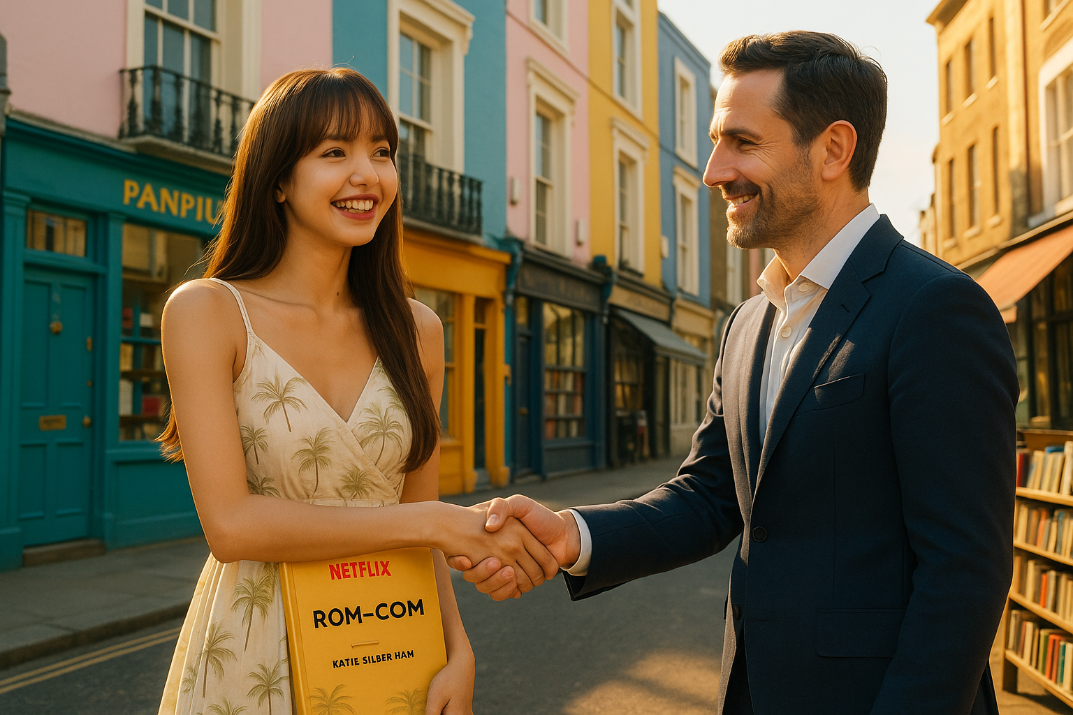 Blackpink's Lisa reteams with White Lotus EP David Bernad for a Netflix rom-com, illustrated in a Notting Hill-inspired scene.